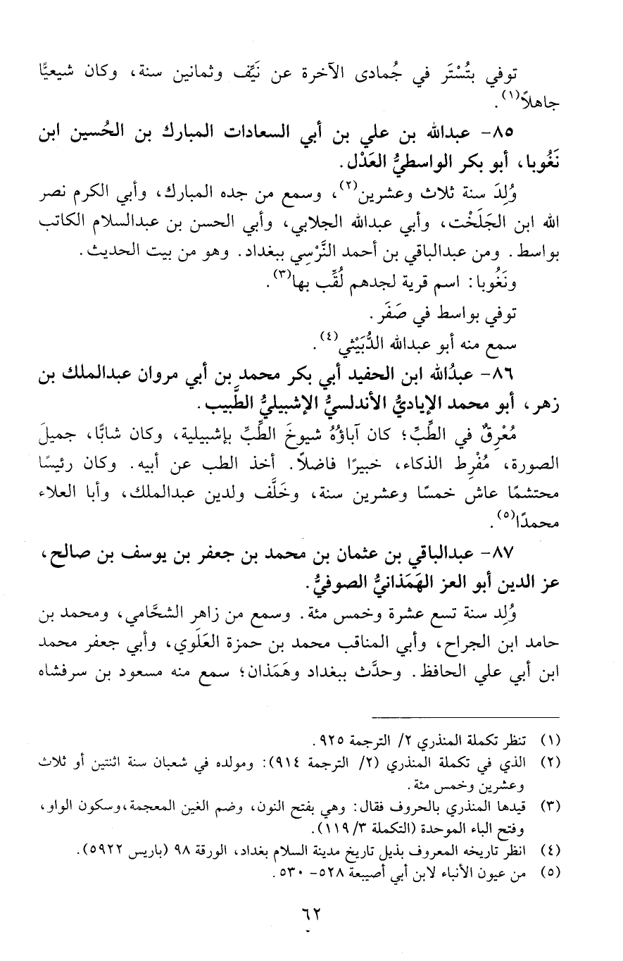 87 - عَبْد الباقي بْن عُثْمَان بْن مُحَمَّد بْن جَعْفَر بْن يوسف بْن صالح، عزّ الدّين أَبُو العزّ الهمذاني الصوفي. [المتوفى: 602 هـ]