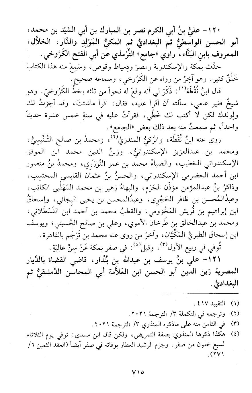 120 - عليّ بن أبي الكَرَم نصرُ بن المبارك بن أبي السَّيِّد بن مُحَمَّد، أبو الحَسَن الواسطيّ ثمّ البَغْداديُّ ثمّ المكّيّ المَوْلِد والدَّار، الخلّال، المعروف بابن البَنَّاء، [المتوفى: 622 هـ]