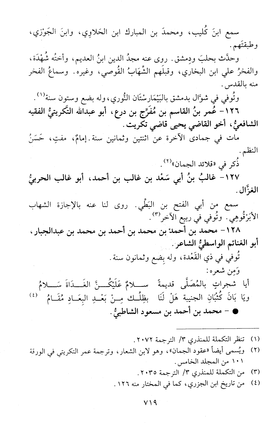 128 - محمد بْن أَحْمَد بْن مُحَمَّد بْن أَحْمَد بْن مُحَمَّد بْن عَبْد الجبّار، أبو الغنائم الواسطيّ الشاعر. [المتوفى: 622 هـ]