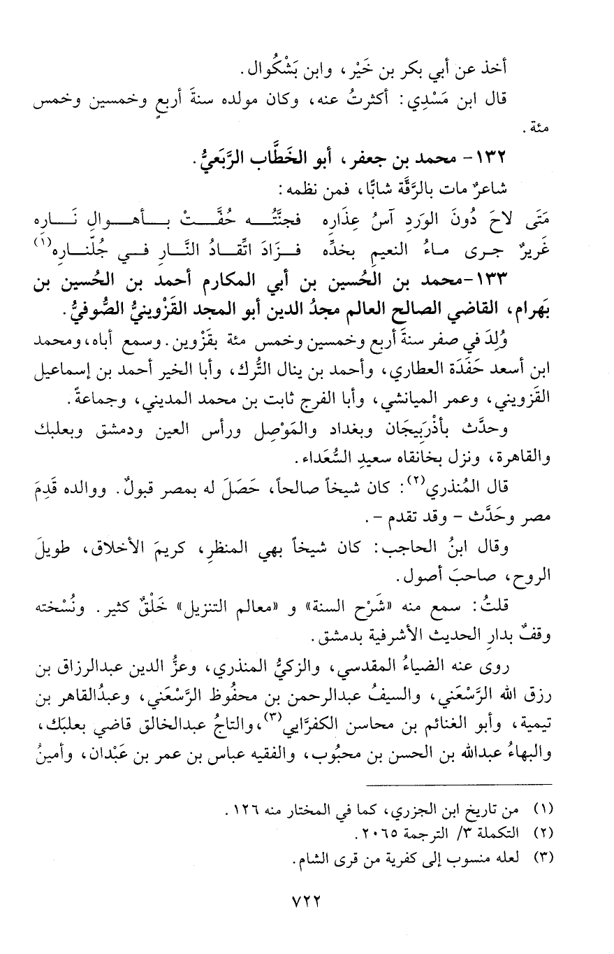 133 - مُحَمَّد بن الْحُسَيْن بْن أَبِي المكارم أَحْمَد بْن الْحَسَين بن بهرام، القاضي الصالح العالم مجدُ الدِّين أبو المجد القَزْوينيُّ الصُّوفيّ. [المتوفى: 622 هـ]