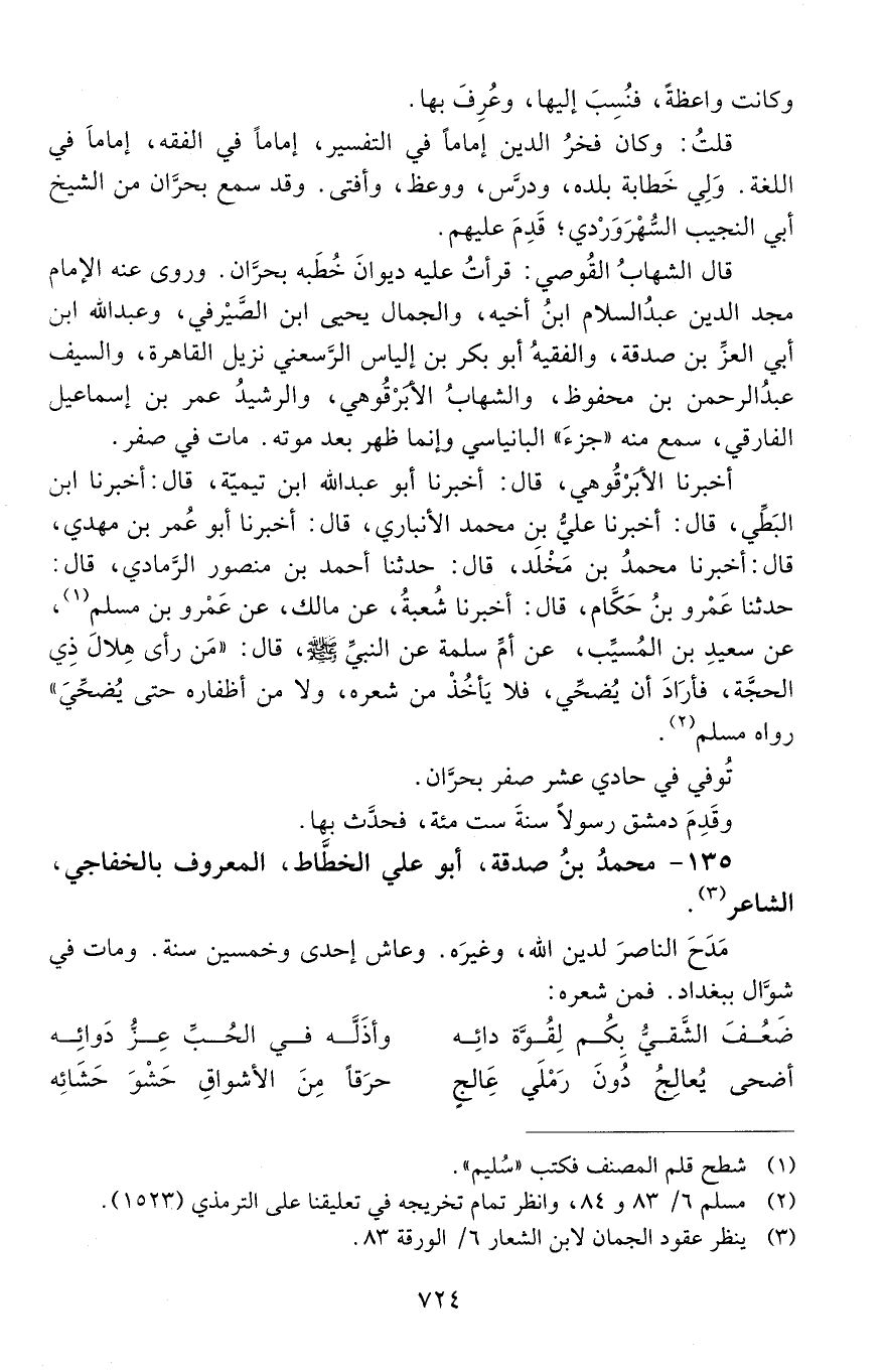135 - محمد بن صَدَقَة، أبو عليّ الخطَّاط المعروف بالخَفَاجيّ، الشاعر. [المتوفى: 622 هـ]