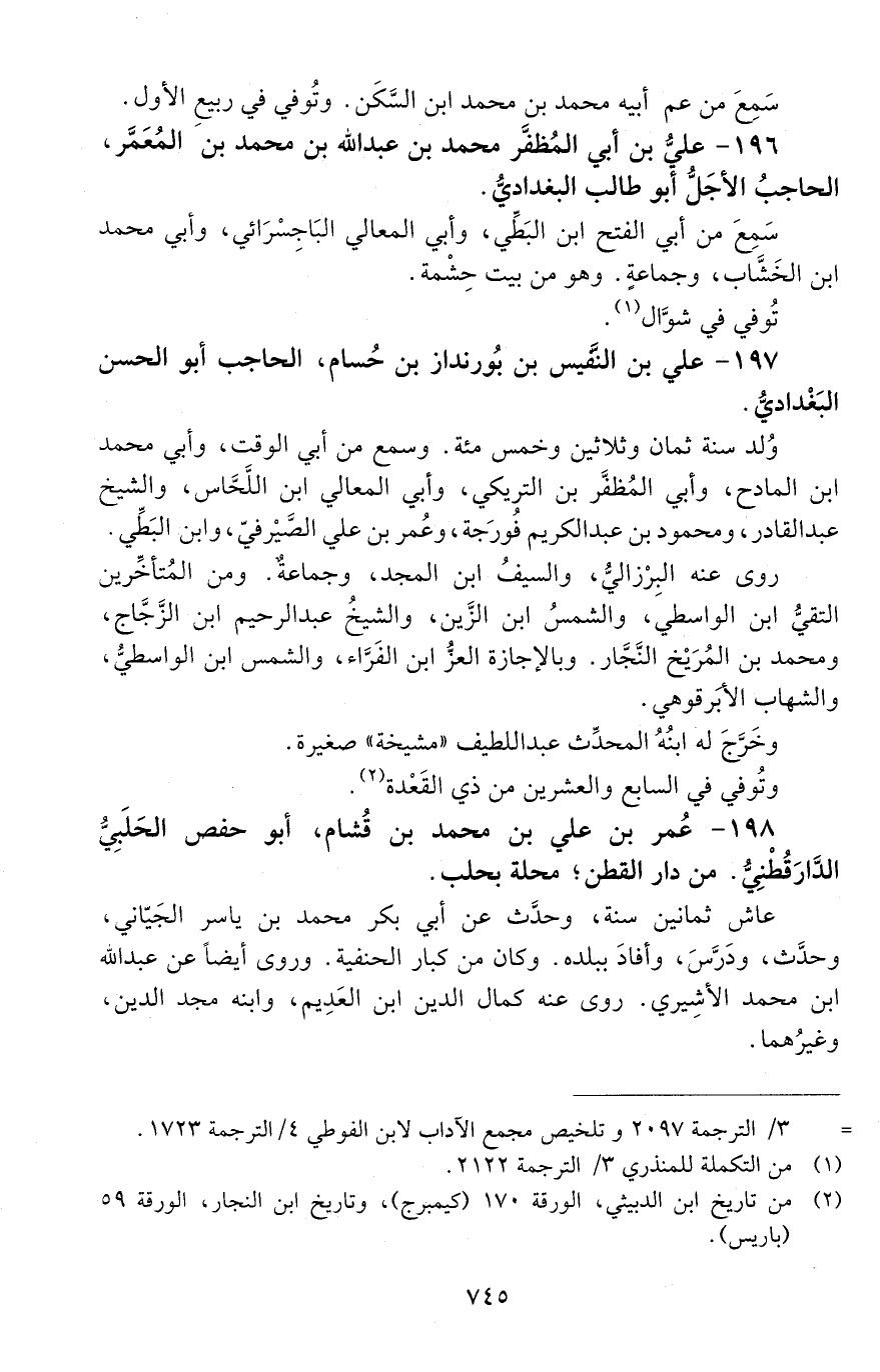 197 - عليّ بن النَّفيس بن بُورنداز بن حُسام، الحاجب أبو الحَسَن البَغْداديُّ. [المتوفى: 623 هـ]