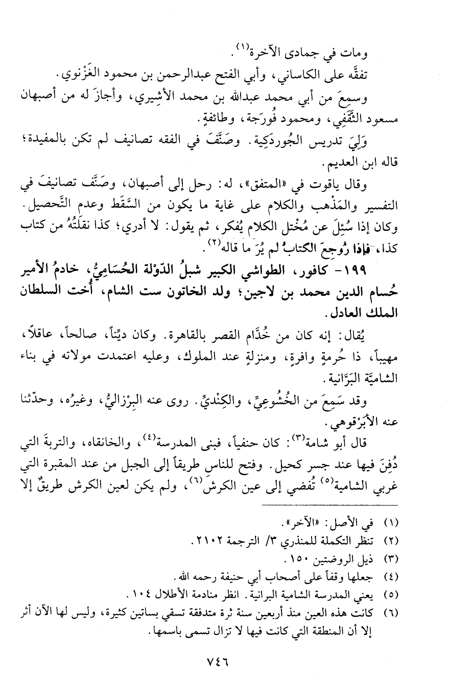 قال أبو شامة: كَانَ حنفيًا، فبنى المدرسة، والخانقاه، والتربةَ التي دُفِنَ فيها عند جسر كحيل. وفتح للنّاسِ طريقًا إلى الجبل من عند المقبرة الّتي غربيّ الشامية تُفضي إلى عين الكرش، ولم يكن لعين الكرش طريقٌ إلّا -[747]- من جهة مسجد الصّفي، يعني الّذي عند مخازن الفاكهة. تُوُفّي في رجب.