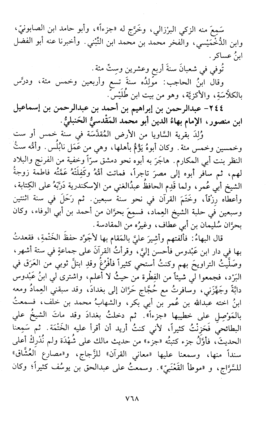 244 - عبد الرحمن بْن إِبْرَاهِيم بْن أَحْمَد بْن عَبْد الرَّحْمَن بْن إِسْمَاعِيل بن منصور، الإمام بهاء الدِّين أبو محمد المَقْدِسيُّ الحَنْبَليّ. [المتوفى: 624 هـ]
