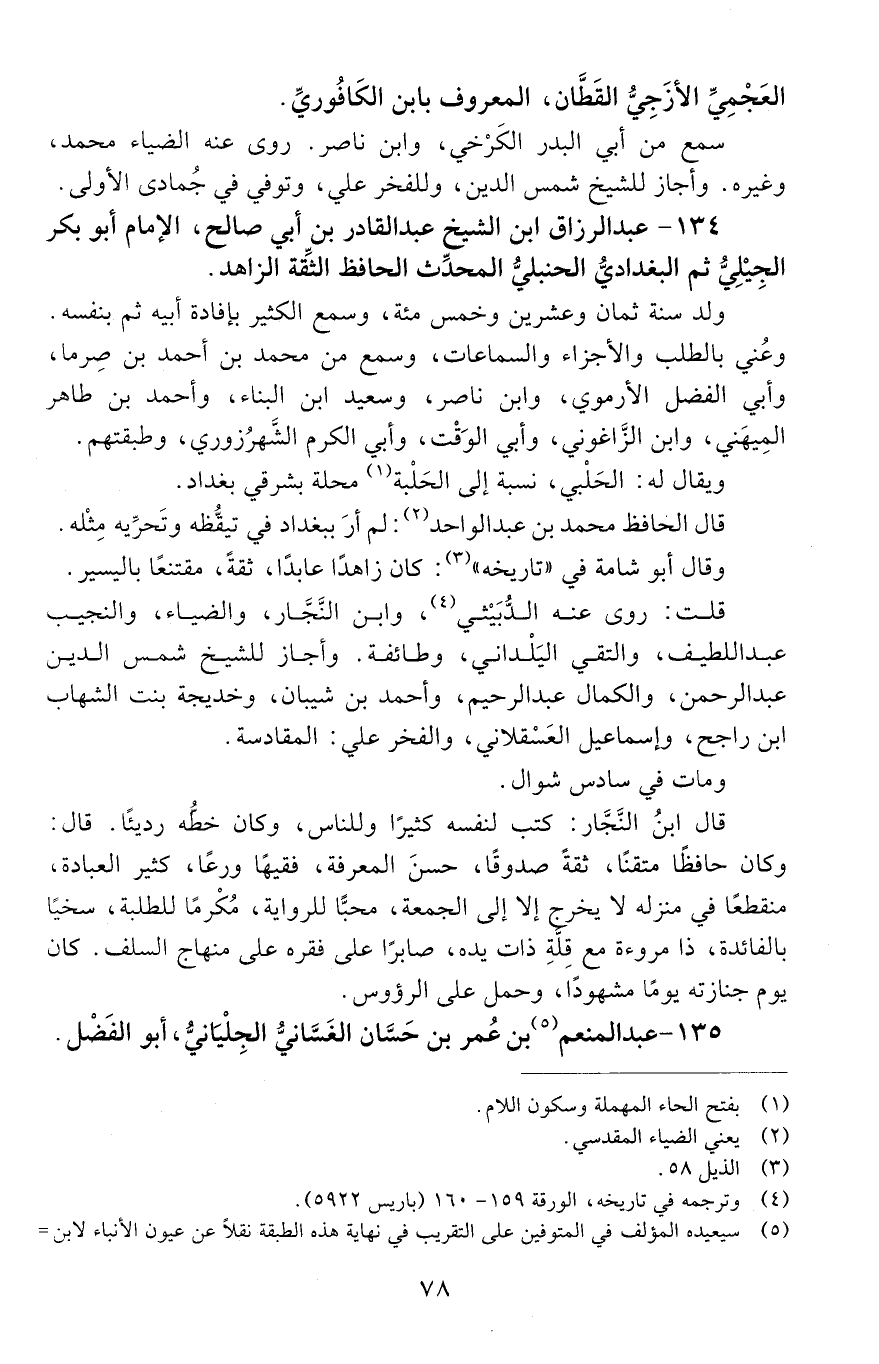 134 - عبد الرزاق ابن الشيخ عبد القادر بن أَبِي صالح، الإمام أَبُو بَكْر الجيليُّ ثُمَّ البغداديُّ الحنبليُّ المحدِّث الحافظ الثِّقة الزاهد. [المتوفى: 603 هـ]