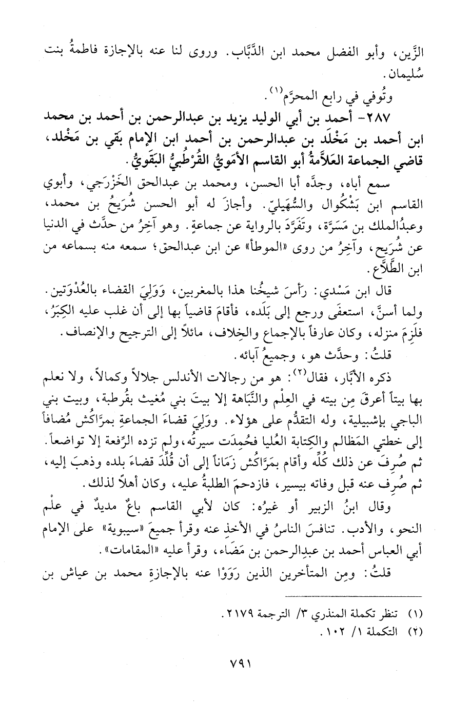 287 - أحمدُ بن أبي الوليد يزيد بْن عَبْد الرَّحْمَن بْن أَحْمَد بْن مُحَمَّد بْن أَحْمَد بْن مَخْلَد بْن عَبْد الرحمن بن أحمد ابن الإمام بَقِيّ بن مَخْلَد، قاضي الجماعة العَلَّامةُ أبو القاسم الأُمَويّ القُرْطُبيّ البَقَوِيُّ. [المتوفى: 625 هـ]