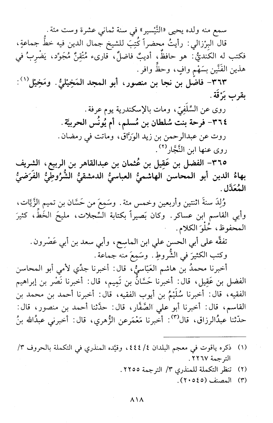 365 - الفضل بن عَقِيل بْن عُثمان بْن عَبْد القاهر بْن الربيع، الشريف بهاءُ الدِّين أبو المحاسن الهاشميُّ العبّاسيّ الدّمشقيُّ الشُّرُوطيُّ الفَرَضيُّ المعدّل. [المتوفى: 626 هـ]