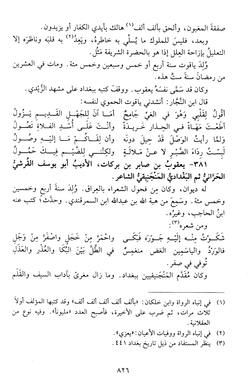 381 - يعقوبُ بن صابر بن بركات، الأَديبُ أبو يوسُف القُرَشيُّ الحَرّانيُّ ثمّ البَغْداديُّ المَنْجَنِيقيُّ الشَّاعر. [المتوفى: 626 هـ]