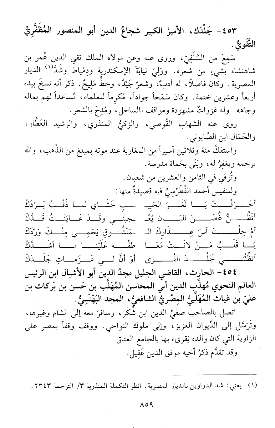 454 - الحارث، القاضي الجليل مجدُ الدِّين أبو الأشبال ابن الرئيس العالِم النَّحْويّ مهذّب الدِّين أبي المحاسن المُهَلَّب بن حَسن بن بَركات بن عليّ بن غِياث المُهَلَّبيّ المِصْريّ الشّافعيُّ المجد البَهْنَسِيُّ. [المتوفى: 628 هـ]