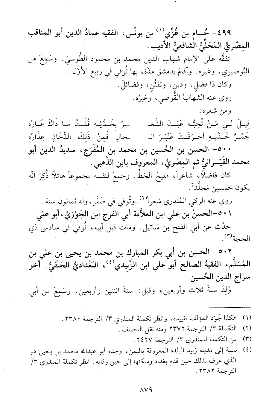 499 - حُسامُ بن غَزِّي بن يونُس، الفقيه عمادُ الدِّين أبو المناقب المِصْريّ المَحَلِّيُّ الشّافعيّ الأديب. [المتوفى: 629 هـ]