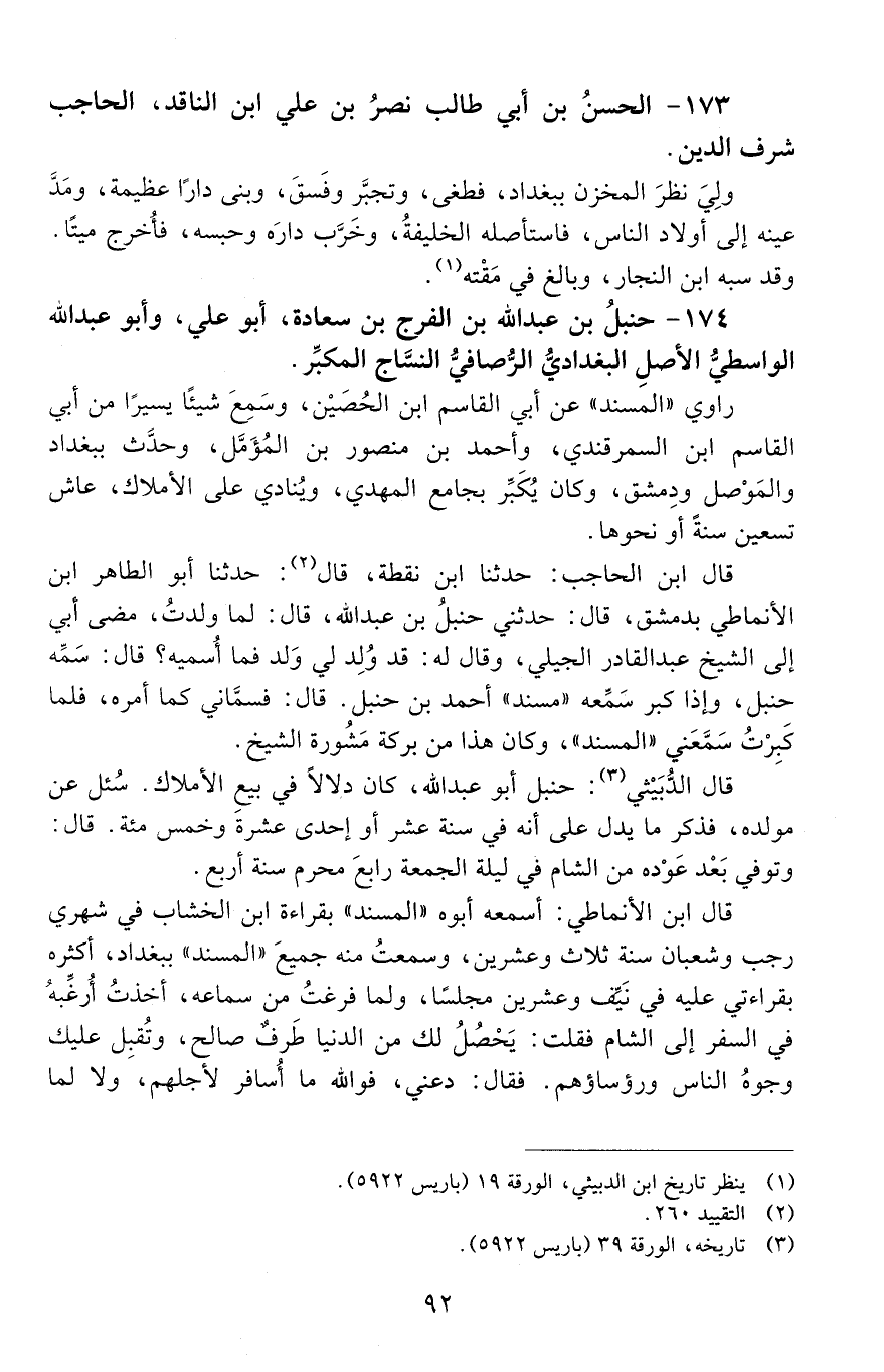174 - حنبلُ بنُ عَبْد الله بْن الفَرَج بْن سعادة، أَبُو عليّ، وأَبُو عَبْد الله الواسطيُّ الأصلِ البغداديّ الرُّصافيّ النسَّاج المكبِّر. [المتوفى: 604 هـ]