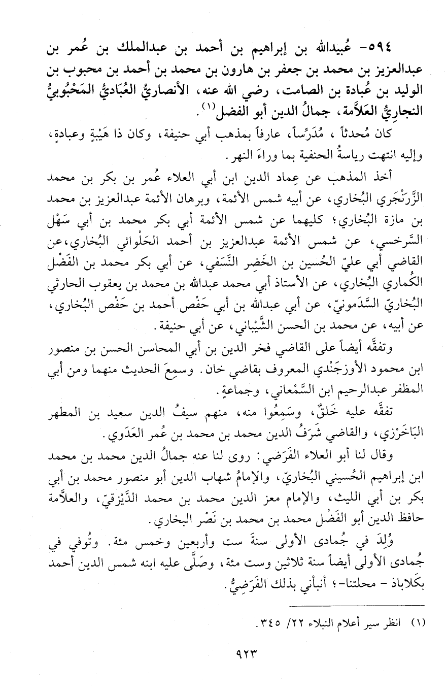594 - عُبَيْد الله بن إبراهيم بن أحمد بن عَبْدِ الْمَلِكِ بْنِ عُمَر بْن عَبْد الْعَزِيزِ بْن مُحَمَّد بْن جعفر بن هارون بن محمد بن أحمد بن محبوب بن الوليد بن عبّادة بن الصامت، رَضِيَ اللَّهُ عنه، الأنصاريّ العبادي المحبوبي النجاري العَلَّامة جمال الدِّين أبو الفضل. [المتوفى: 630 هـ]