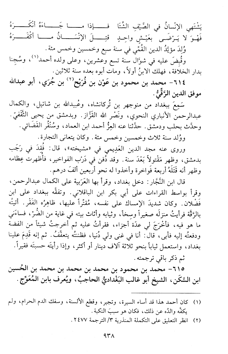 615 - مُحَمَّد بن محمود بْن مُحَمَّد بْن مُحَمَّد بْن مُحَمَّد بْن الحسين، ابن السكن، الشيخ أبو غالب البَغْداديُّ الحاجب، ويعرف بابن المعوّج. [المتوفى: 630 هـ]-[939]-