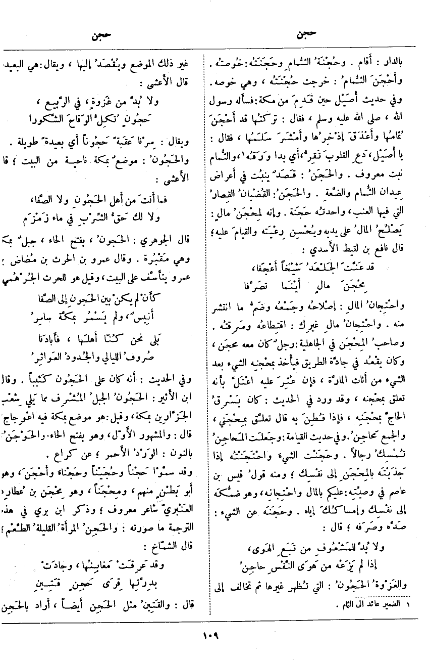 وَقَالَ ابْنُ الأَثير: الحَجُونُ الجبلُ المُشْرِف مِمَّا يَلي شِعْب الجَزَّارين بِمَكَّةَ، وَقِيلَ: هُوَ مَوْضِعٌ بِمَكَّةَ فِيهِ اعْوِجاج، قَالَ: وَالْمَشْهُورُ الأَوَّل، وَهُوَ بِفَتْحِ الْحَاءِ. والحَوْجَنُ، بِالنُّونِ: الوَرْدُ الأَحمر؛ عَنْ كُرَاعٍ. وَقَدْ سمَّوْا حَجْناً وحُجَيْناً وحَجْناءَ وأَحْجَنَ، وَهُوَ أَبو بَطْنٍ مِنْهُمْ، ومِحْجَناً، وَهُوَ مِحْجَن بْنُ عُطارِد العَنْبَريّ شَاعِرٌ مَعْرُوفٌ؛ وَذَكَرَ ابْنُ بَرِّيٍّ فِي هَذِهِ التَّرْجَمَةِ مَا صُورَتُهُ: والحَجِنُ المرأَةُ القليلةُ الطَّعْم؛ قَالَ الشَّمَّاخِ: