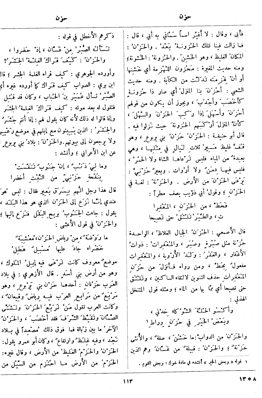 والحَزْنُ: المكانُ الْغَلِيظُ، وَهُوَ الخَشِنُ. والحُزونةُ: الخُشونة؛ وَمِنْهُ حَدِيثُ