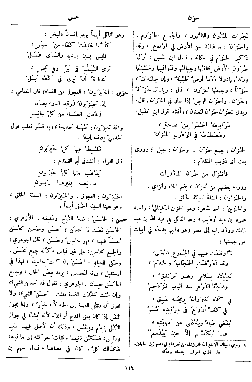 . وَرَوَاهُ بَعْضُهُمْ مِنْ حُزُن، بِضَمِّ الْحَاءِ وَالزَّايِ. والحَزُون: الشَّاةُ السيِّئة الخُلق. والحَزينُ: اسْمُ شَاعِرٍ، وَهُوَ الْحَزِينُ الكِنانيُّ، وَاسْمُهُ عَمْرُو بْنُ عَبْدِ وُهَيب، وَهُوَ الْقَائِلُ فِي عَبْدِ اللَّهِ بْنِ عَبْدِ الْمَلِكِ ووفَد إِلَيْهِ إِلَى مِصْرَ وَهُوَ وَالِيهَا يمدحُه فِي أَبيات مِنْ جُمْلَتِهَا:
