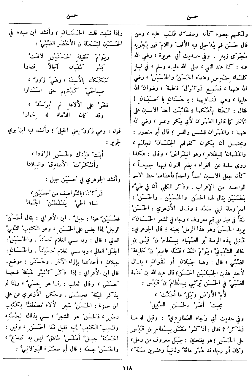 ؛ غَلَّبَت أَحدَ الِاسْمَيْنِ عَلَى الْآخَرِ كَمَا قَالُوا العُمَران لأَبي بَكْرٍ وَعُمَرَ، رَضِيَ اللَّهُ عَنْهُمَا، والقَمَران لِلشَّمْسِ وَالْقَمَرِ؛ قَالَ أَبو مَنْصُورٍ: وَيَحْتَمِلُ أَن يَكُونَ كَقَوْلِهِمُ الجَلَمانُ للجَلَم، والقَلَمانُ للمِقْلامِ، وَهُوَ المِقْراضُ، وَقَالَ: هَكَذَا رَوَى سَلَمَةُ عَنِ الْفَرَّاءِ، بِضَمِّ النُّونِ فِيهِمَا جَمِيعًا، كأَنه جَعَلَ الِاسْمَيْنِ اسْمًا وَاحِدًا فأَعطاهما حَظَّ الِاسْمِ الْوَاحِدِ مِنَ الإِعراب. وَذَكَرَ الْكَلْبِيُّ أَن فِي طيِء بَطْنَيْن يُقَالُ لَهُمَا الحسَن والحُسَيْن. والحَسَنُ: اسمُ رَمْلَةٍ لِبَنِي سَعْد؛ وَقَالَ الأَزهري: الحَسَنُ نَقاً فِي دِيَارِ بَنِي تَمِيمٍ مَعْرُوفٌ، وَجَاءَ فِي الشِّعْرِ الحَسَنانُ، يُرِيدُ الحَسَنَ وَهُوَ هَذَا الرملُ بِعَيْنِهِ؛ قَالَ الْجَوْهَرِيُّ: قُتِل بِهَذِهِ الرَّمْلَةِ أَبو الصَّهْباء بِسْطامُ بنُ قيْس بنِ خالدٍ الشَّيْبانيِّ، يَوْمَ النَّقَا، قتَله عاصِمُ بْنُ خَلِيفةَ الضَّبِّي، قَالَ: وهما جَبَلانِ أَو نَقَوانِ، يُقَالُ لأَحد هذين الجَبَلَيْن الحَسَن؛ قَالَ عَبْدُ اللَّهِ بْنُ عَنَمة الضَّبّيّ فِي الحَسَن يَرْثِي بِسْطَامَ بنَ قَيْس: