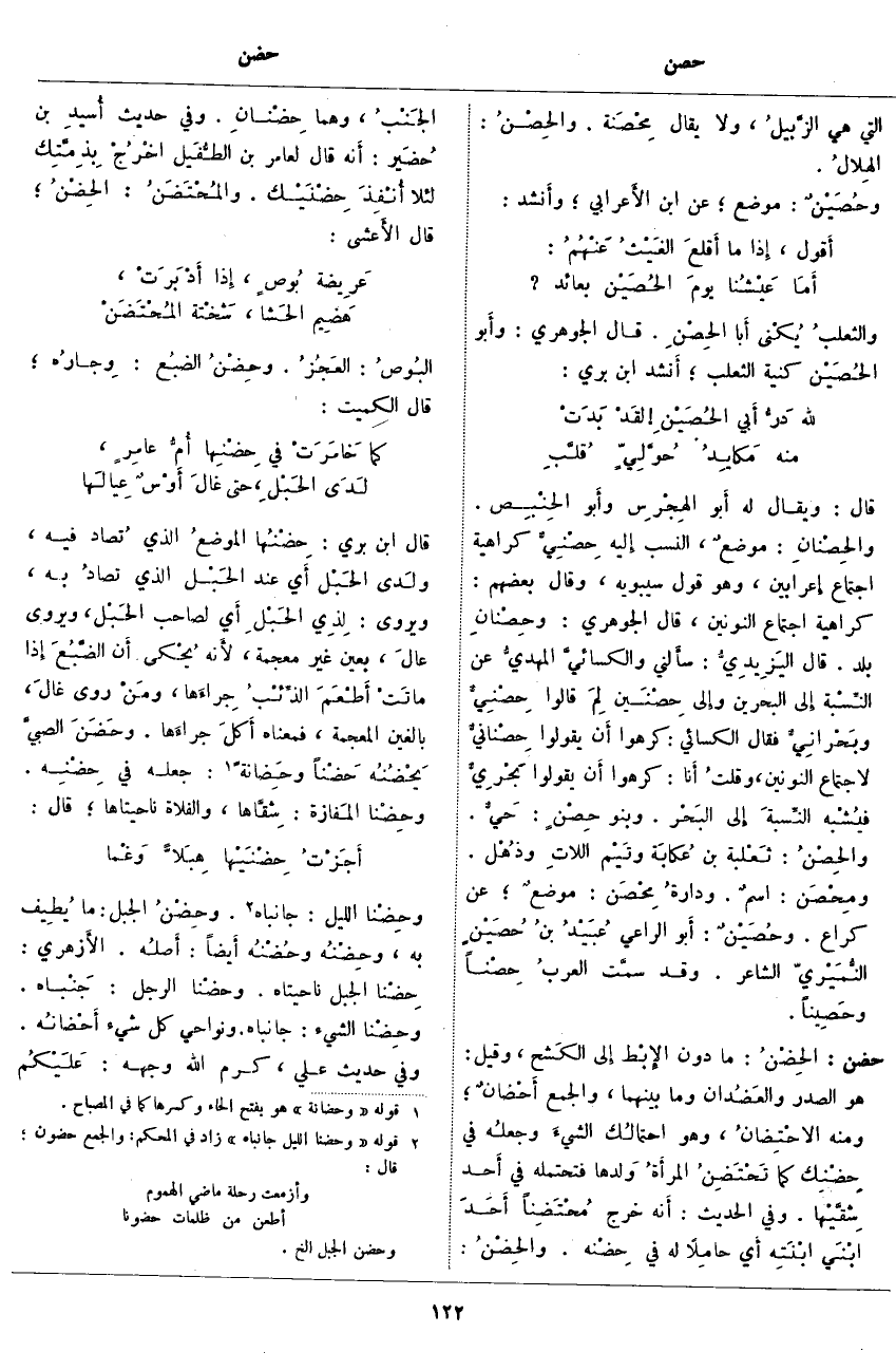 . قَالَ ابْنُ بَرِّيٍّ: حِضْنُها الموضعُ الَّذِي تُصاد فِيهِ، ولَدى الحَبْل أَي عِنْدِ الحَبْل الَّذِي تصادُ بِهِ، وَيُرْوَى: لِذِي الحَبْلِ أَي لِصَاحِبِ الحَبْل، وَيُرْوَى عالَ، بِعَيْنٍ غَيْرِ مُعْجَمَةٍ، لأَنه يُحْكى أَن الضَّبُعَ إِذا ماتَتْ أَطْعَمَ الذِّئْبُ جِراءَها، ومَنْ رَوَى غالَ، بِالْغَيْنِ الْمُعْجَمَةِ، فَمَعْنَاهُ أَكَلَ جراءَها. وحَضَنَ الصبيَّ يَحْضُنُه حَضْناً وحَضانةً [حِضانةً] «1».: جَعَلَهُ فِي حِضْنِه وحِضْنا المَفازه: شِقَّاها، وَالْفَلَاةِ نَاحِيَتَاهَا؛ قَالَ: