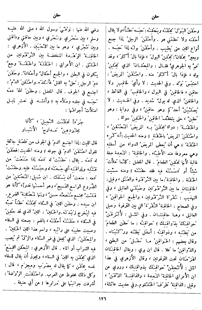 ، وَهُوَ مَا بَيْنَ اللَّحْيَين. الأَزهري: الحاقِنةُ الوَهْدة الْمُنْخَفِضَةُ بَيْنَ التَّرْقُوتين مِنَ الحَلْق. ابْنُ الأَعرابي: الحَقْلَةُ والحَقْنةُ وجعٌ يَكُونُ فِي الْبَطْنِ، وَالْجَمْعُ أَحْقالٌ وأَحْقانٌ. وحَقَنَ دَمَ الرجلِ: حَلَّ بِهِ القتلُ فأَنْقذَه. واحْتَقَنَ الدَّمُ: اجْتَمَعَ فِي الْجَوْفِ. قَالَ الْمُفَضَّلُ: وحقَنَ اللهُ دمَه حَبَسه فِي جِلْدِهِ ومَلأَه بِهِ؛ وأَنشد فِي نعتِ إِبِلٍ امتلأَتْ أَجوافُها: