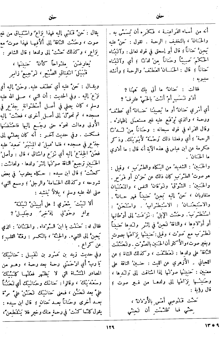 والحَنينُ: الشديدُ مِنَ البُكاءِ والطَّرَبِ، وَقِيلَ: هُوَ صوتُ الطَّرَبِ كَانَ ذَلِكَ عَنْ حُزْنٍ أَو فَرَحٍ. والحَنِينُ: الشَّوْقُ وتَوَقانُ النَّفس، والمَعْنَيان مُتَقَارِبَانِ، حَنَّ إِلَيْهِ يَحِنُّ حَنِيناً فَهُوَ حانٌّ. والاسْتِحْنانُ: الاسْتِطْرابُ. واسْتَحَنَّ: اسْتَطْرَبَ: وحَنَّت الإِبلُ: نَزَعَتْ إِلَى أَوْطانِها أَو أَوْلادِها، والناقةُ تَحِنُّ فِي إِثْرِ ولَدِها حَنِيناً تَطْرَب مَعَ صَوْت، وَقِيلَ: حَنِينُها نِزَاعُها بصوتٍ وبغير يصوتٍ والأَكثر أَن الحَنين بالصَّوْتِ. وتَحَنَّنَت النّاقةُ عَلَى ولدِها: تَعَطَّفَت، وَكَذَلِكَ الشَّاةُ؛ عَنِ اللِّحْيَانِيِّ. الأَزهري عَنِ اللَّيْثِ: حنينُ النَّاقَةِ عَلَى مَعْنَيَيْنِ: حَنِينُها صوْتُها إِذَا اشْتَاقَتْ إِلَى وَلَدِها، وحَنينُها نِزَاعُها إِلَى وَلَدِهَا مِنْ غَيْرِ صَوْتٍ؛ قَالَ رُؤْبَةُ: