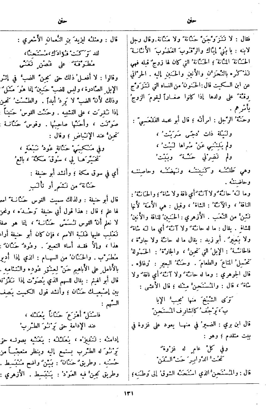 قَالَ أَبو حَنِيفَةَ: وَلِذَلِكَ سُمِّيَتِ الْقَوْسُ حَنَّانةً اسْمٌ لَهَا عَلَمٌ؛ قَالَ: هَذَا قَوْلُ أَبي حَنِيفَةَ وَحْدَه، وَنَحْنُ لَا نَعْلَمُ أَنَّ الْقَوْسَ تُسَمَّى حَنَّانةً، إِنما هُوَ صِفَةٌ تَغْلِب عَلَيْهَا غَلَبة الِاسْمِ، فإِن كَانَ أَبو حَنِيفَةَ أَراد هَذَا، وإِلَّا فَقَدْ أَساءَ التعبيرَ. وعُودٌ حَنَّانٌ: مُطَرِّب. والحَنَّانُ مِنَ السِّهَامِ: الَّذِي إِذا أُديرَ بالأَناملِ عَلَى الأَباهِيم حَنّ لِعِتْقِ عُودِه والْتئامِهِ. قَالَ أَبو الْهَيْثَمِ: يُقَالُ لِلسَّهْمِ الَّذِي يُصَوِّت إِذا نَفَّزْته بَيْنَ إِصْبعيك حَنَّان؛ وأَنشد قَوْلَ الْكُمَيْتِ يَصِف السَّهم: