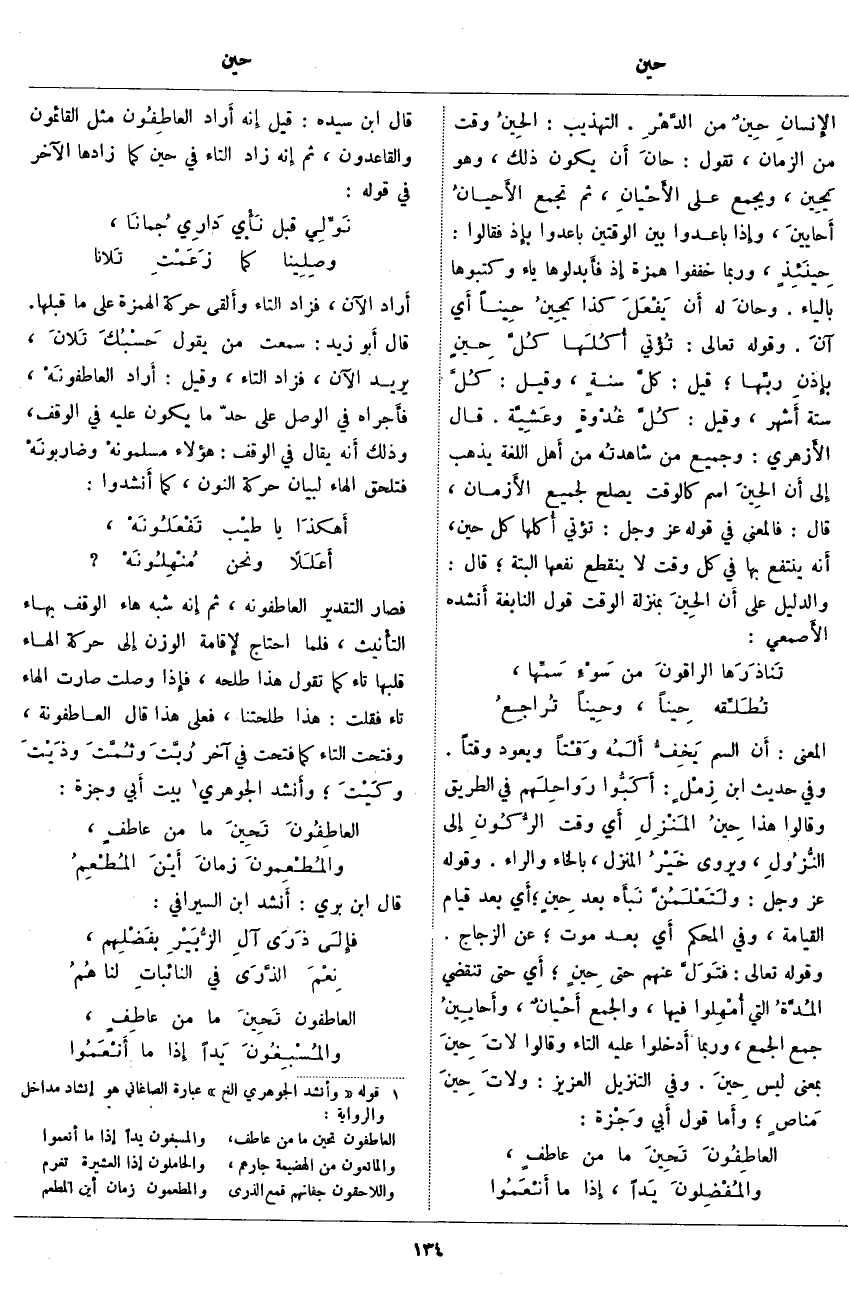 . قَالَ ابْنُ سِيدَهْ: قِيلَ إِنه أَراد العاطِفُونَ مِثْلَ الْقَائِمُونَ وَالْقَاعِدُونَ، ثُمَّ إِنه زَادَ التَّاءَ فِي حِينَ كَمَا زَادَهَا الْآخَرُ فِي قَوْلِهِ: