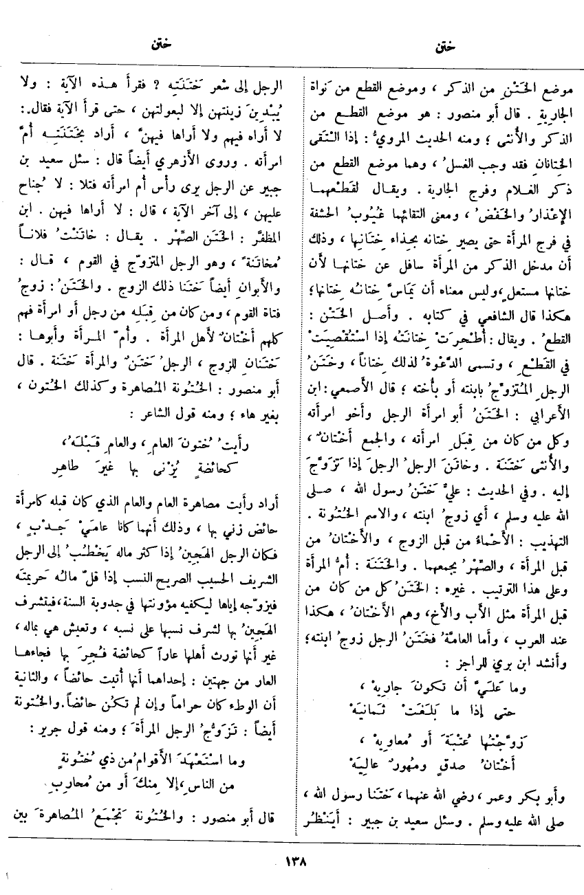 ، وَهُمَا مَوْضِعُ الْقَطْعِ مِنْ ذَكَرِ الْغُلَامِ وَفَرْجِ الْجَارِيَةِ. وَيُقَالُ لقَطْعهما الإِعْذارُ والخَفْضُ، وَمَعْنَى الْتِقَائِهِمَا غُيُوبُ الْحَشَفَةِ فِي فَرْجِ المرأَة حَتَّى يَصِيرَ خِتانه بِحِذَاءِ خِتَانِها، وَذَلِكَ أَن مَدْخَلَ الذَّكَرِ مِنَ المرأَة سَافِلٌ عَنْ خِتانِها لأَن خِتَانَهَا مستعلٍ، وَلَيْسَ مَعْنَاهُ أَن يَمَاسَّ خِتانُه خِتَانَهَا؛ هَكَذَا قَالَ الشَّافِعِيُّ فِي كِتَابِهِ. وأَصل الخَتْن: القطعُ. وَيُقَالُ: أُطْحِرَتْ خِتانَتُه إِذا اسْتُقْصِيَتْ فِي القَطْعِ، وَتُسَمَّى الدَّعْوةُ لِذَلِكَ خِتاناً، وخَتَنُ الرجلِ المُتزوِّجُ بِابْنَتِهِ أَو بأُخته؛ قَالَ الأَصمعي: ابْنُ الأَعرابي: الخَتَنُ أَبو امرأَة الرَّجُلِ وأَخو امرأَته وَكُلُّ مَنْ كَانَ مِنْ قِبَلِ امرأَته، وَالْجَمْعُ أَخْتانٌ، والأُنثى خَتَنَة. وخاتَنَ الرجلُ الرجلَ إِذا تَزَوَّجَ إِليه. وَفِي الْحَدِيثِ: