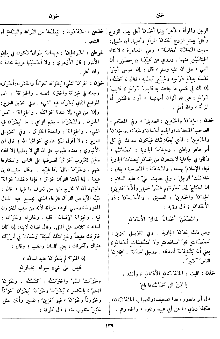 خدن: الخِدْنُ والخَدِين: الصديقُ، وَفِي الْمُحْكَمِ: الصاحبُ المُحدِّثُ، وَالْجَمْعُ أَخْدانٌ وخُدَناء. والخِدْنُ والخَدِينُ: الَّذِي يُخَادِنُك فَيَكُونُ مَعَكَ فِي كُلِّ أَمر ظَاهِرٍ وَبَاطِنٍ. وخِدْنُ الْجَارِيَةِ: مُحَدِّثُها، وَكَانُوا فِي الْجَاهِلِيَّةِ لَا يَمْتَنِعُونَ مِنْ خِدْنٍ يُحَدِّثُ الْجَارِيَةَ فَجَاءَ الإِسلامُ بِهَدْمِهِ. والمُخادَنة: المُصاحبة، يُقَالُ: خادَنْتُ الرجلَ. وَفِي حَدِيثِ