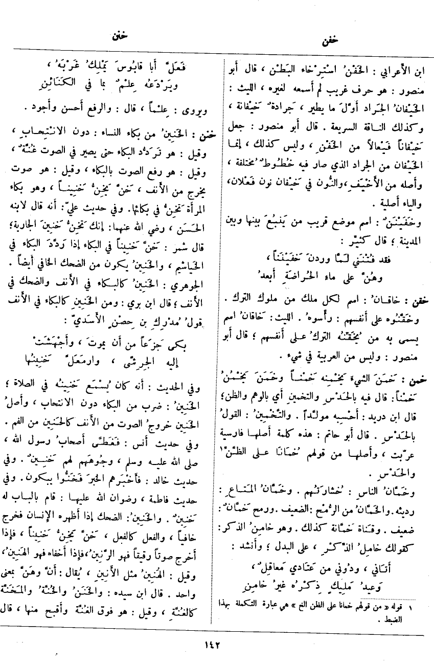 خنن: الخَنِينُ مِنْ بُكَاءِ النِّسَاءِ: دُونَ الانْتِحابِ، وَقِيلَ: هُوَ تَرَدُّد الْبُكَاءِ حَتَّى يَصِيرَ فِي الصَّوْتِ غُنَّةٌ، وَقِيلَ: هُوَ رَفْعُ الصَّوْتِ بِالْبُكَاءِ، وَقِيلَ: هُوَ صَوْتٌ يَخْرُجُ مِنْ الأَنف، خَنَّ يَخِنُّ خَنِيناً، وَهُوَ بُكَاءُ المرأَةُ تَخِنُّ فِي بُكَائِهَا. وَفِي حَدِيثِ