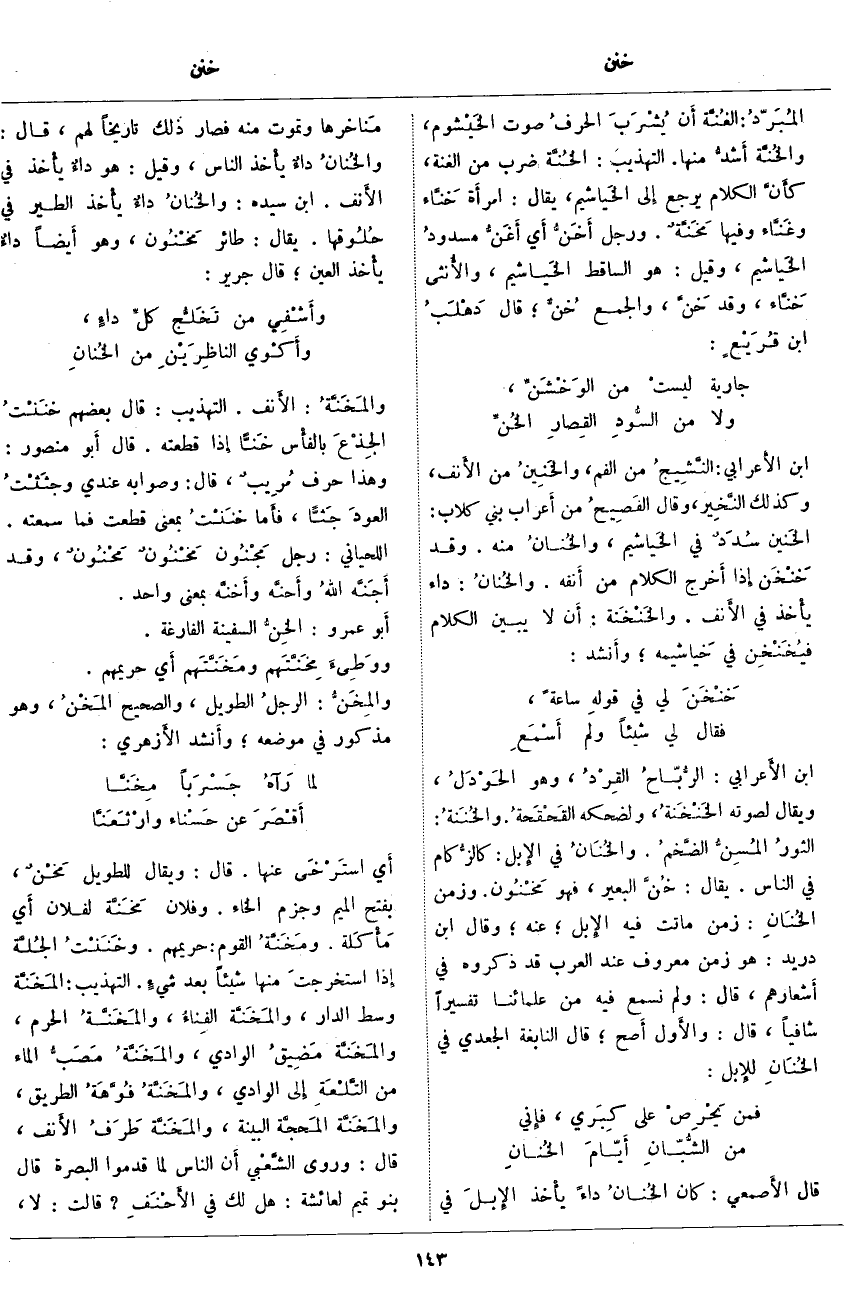 . والمَخَنَّةُ: الأَنف. التَّهْذِيبُ: قَالَ بَعْضُهُمْ خَنَنْتُ الجِذْعَ بالفأْس خَنّاً إِذَا قَطَعْتَهُ. قَالَ أَبو مَنْصُورٍ: وَهَذَا حَرْفٌ مُريبٌ، قَالَ: وَصَوَابُهُ عِنْدِي وجثَثْتُ العودَ جَثًّا، فأَما خَنَنْتُ بِمَعْنَى قَطَعْتُ فَمَا سَمِعْتُهُ. اللِّحْيَانِيُّ: رَجُلٌ مَجْنُون مَخْنُونٌ مَحْنُونٌ، وَقَدْ أَجَنَّه اللهُ وأَحَنَّه وأَخنَّه بِمَعْنًى وَاحِدٍ. أَبو عَمْرٍو: الخِنُّ السَّفِينَةُ الْفَارِغَةُ. ووَطِئَ مِخَنَّتَهم ومَخَنَّتَهم أَي حَرِيمُهُمْ. والمِخَنُّ: الرجلُ الطَّوِيلُ، وَالصَّحِيحُ المَخْنُ، وَهُوَ مَذْكُورٌ فِي مَوْضِعِهِ؛ وأَنشد الأَزهري: