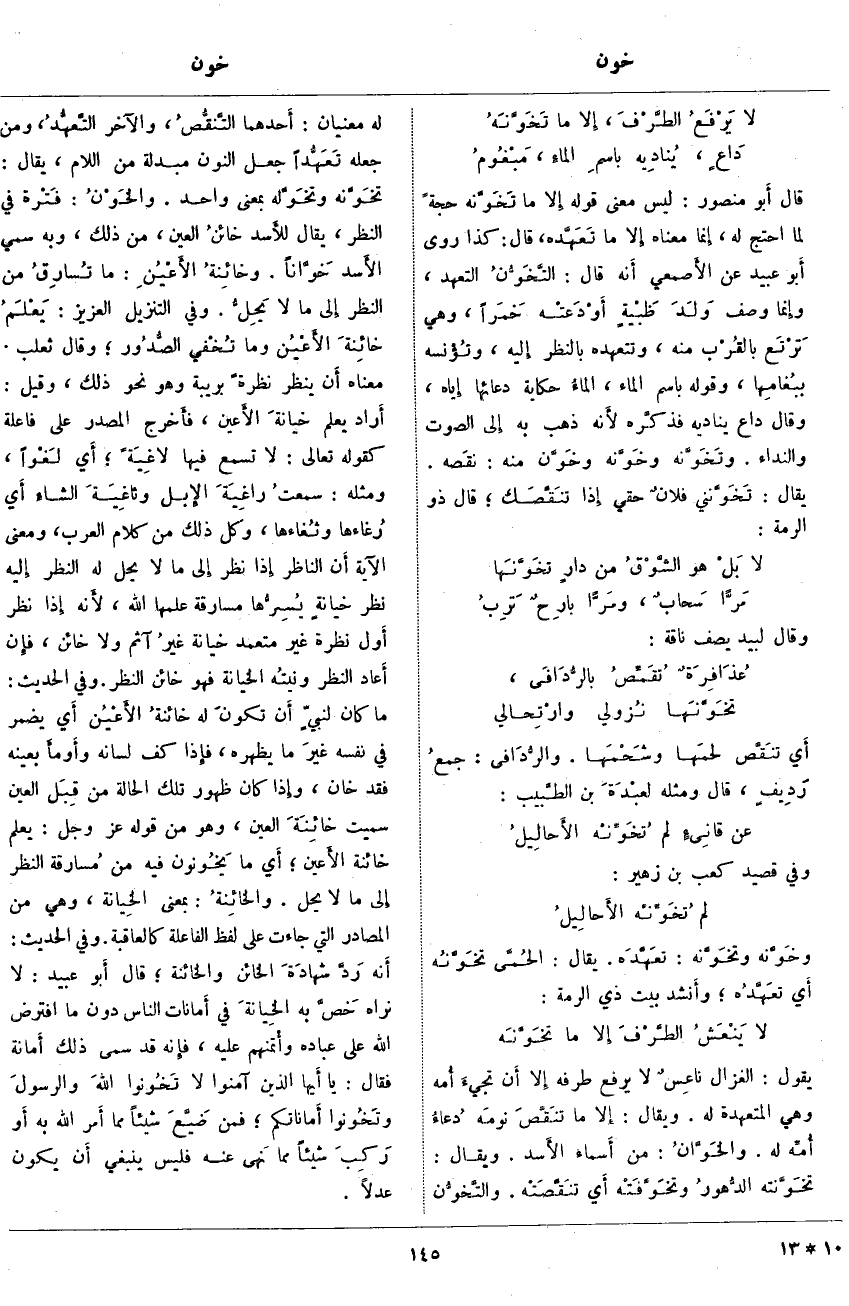 يَقُولُ: الْغَزَالُ ناعِسٌ لَا يَرْفَعُ طَرْفَهُ إِلَّا أَن تجيءَ أُمه وَهِيَ الْمُتَعَهِّدَةُ لَهُ. وَيُقَالُ: إِلَّا مَا تنَقَّصَ نومَه دُعاءُ أُمِّه لَهُ. والخَوَّانُ: مِنْ أَسماء الأَسد. وَيُقَالُ: تخَوَّنته الدُّهورُ وتخَوَّفَتْه أَي تنَقَّصَتْه. والتَّخوُّن لَهُ مَعْنَيَانِ: أَحدهما التَّنقُّصُ، وَالْآخَرُ التَّعُهُّدُ، وَمَنْ جَعَلَهُ تَعَهُّداً جَعَلَ النُّونَ مُبْدَلَةً مِنَ اللَّامِ، يُقَالُ: تخَوَّنه وتخَوَّله بِمَعْنًى وَاحِدٍ. والخَوْنُ: فَتْرة فِي النَّظَرِ، يُقَالُ للأَسد خائنُ الْعَيْنِ، مِنْ ذَلِكَ، وَبِهِ سُمِّيَ الأَسد خَوَّاناً. وخائِنةُ الأَعْيُنِ: مَا تُسارِقُ مِنَ النَّظَرِ إِلى مَا لَا يَحِلُّ. وَفِي التَّنْزِيلِ الْعَزِيزِ: يَعْلَمُ خائِنَةَ الْأَعْيُنِ وَما تُخْفِي الصُّدُورُ