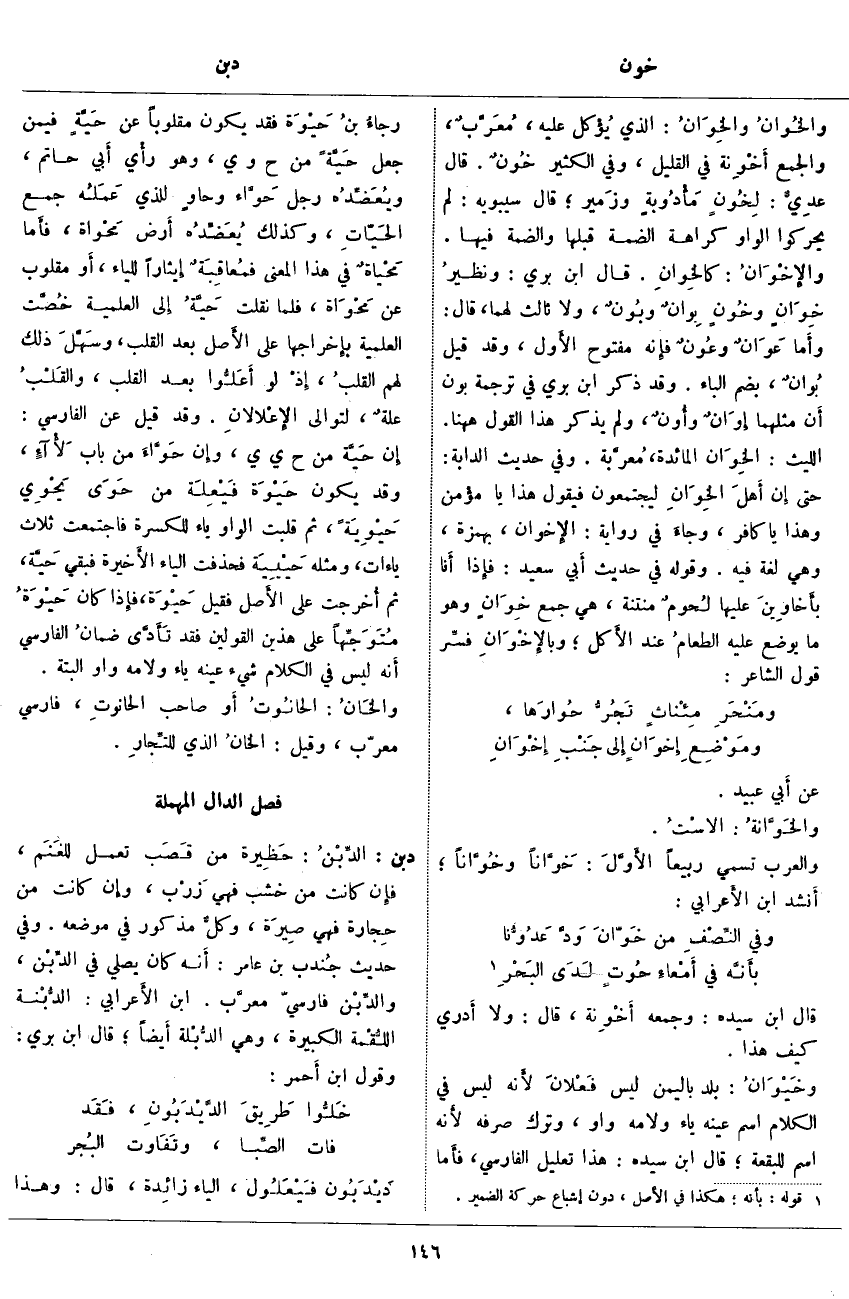 . قَالَ ابْنُ سِيدَهْ: وَجَمْعُهُ أَخْوِنة، قَالَ: وَلَا أَدري كَيْفَ هَذَا. وخَيْوَانُ: بَلَدٌ بِالْيَمَنِ لَيْسَ فَعْلانَ لأَنه لَيْسَ فِي الْكَلَامِ اسْمٌ عَيْنُهُ يَاءٌ وَلَامُهُ وَاوٌ، وَتُرِكَ صَرْفُهُ لأَنه اسْمٌ لِلْبُقْعَةِ؛ قَالَ ابْنُ سِيدَهْ: هَذَا تَعْلِيلُ الْفَارِسِيِّ، فأَما رجاءُ بنُ حَيْوَة فَقَدْ يَكُونُ مَقْلُوبًا عَنْ حيَّةٍ فِيمَنْ جَعَلَ حَيَّةً مِنْ ح وي، وَهُوَ رأْي أَبي حَاتِمٍ، ويُعَضِّدُه رَجُلٌ حَوَّاء وحاوٍ لِلَّذِي عَمَلُه جَمْعُ الحَيّاتِ، وَكَذَلِكَ يُعَضِّدُه أَرض مَحْواة، فأَما مَحْياةٌ فِي هَذَا الْمَعْنَى فمُعاقِبَةٌ إِيثاراً لِلْيَاءِ، أَو مَقْلُوبٌ عَنْ مَحْوَاة، فَلَمَّا نُقِلَتْ حَيَّةُ إِلَى الْعَلَمِيَّةِ خُصَّت الْعَلَمِيَّةُ بِإِخْرَاجِهَا عَلَى الأَصل بَعْدَ الْقَلْبِ، وسَهَّلَ ذَلِكَ لَهُمُ القلبُ، إذْ لَوْ أَعَلُّوا بَعْدَ الْقَلْبِ، والقَلْبُ علةٌ، لَتَوَالَى الإِعْلالانِ. وَقَدْ قِيلَ عَنِ الْفَارِسِيِّ: إِن حَيَّة مِنْ ح ي ي، وإِن حَوَّاءَ مِنْ بَابِ لَأْآءٍ، وَقَدْ يَكُونُ حَيْوَة فَيْعِلَة مِنْ حَوَى يَحْوِي حَيْوِيَةً، ثُمَّ قُلِبَتِ الْوَاوُ يَاءً لِلْكَسْرَةِ فَاجْتَمَعَتْ ثَلَاثُ يَاءَاتٍ، وَمِثْلُهُ حَيْيِيَة فَحُذِفَتِ الْيَاءُ الأَخيرة فَبَقِيَ حَيَّة، ثُمَّ أُخرجت عَلَى الأَصل فَقِيلَ حَيْوَة، فَإِذَا كَانَ حَيْوَةُ مُتَوَجِّهاً عَلَى هَذَيْنِ الْقَوْلَيْنِ فَقَدْ تَأَدَّى ضمانُ الْفَارِسِيِّ أَنه لَيْسَ فِي الْكَلَامِ شَيْءٌ عَيْنُهُ يَاءٌ وَلَامُهُ وَاوٌ الْبَتَّةَ. والخَانُ: الحانُوتُ أَو صَاحِبُ الحانوتِ، فَارِسِيٌّ مُعَرَّبٌ، وَقِيلَ: الخانُ الَّذِي للتِّجارِ.