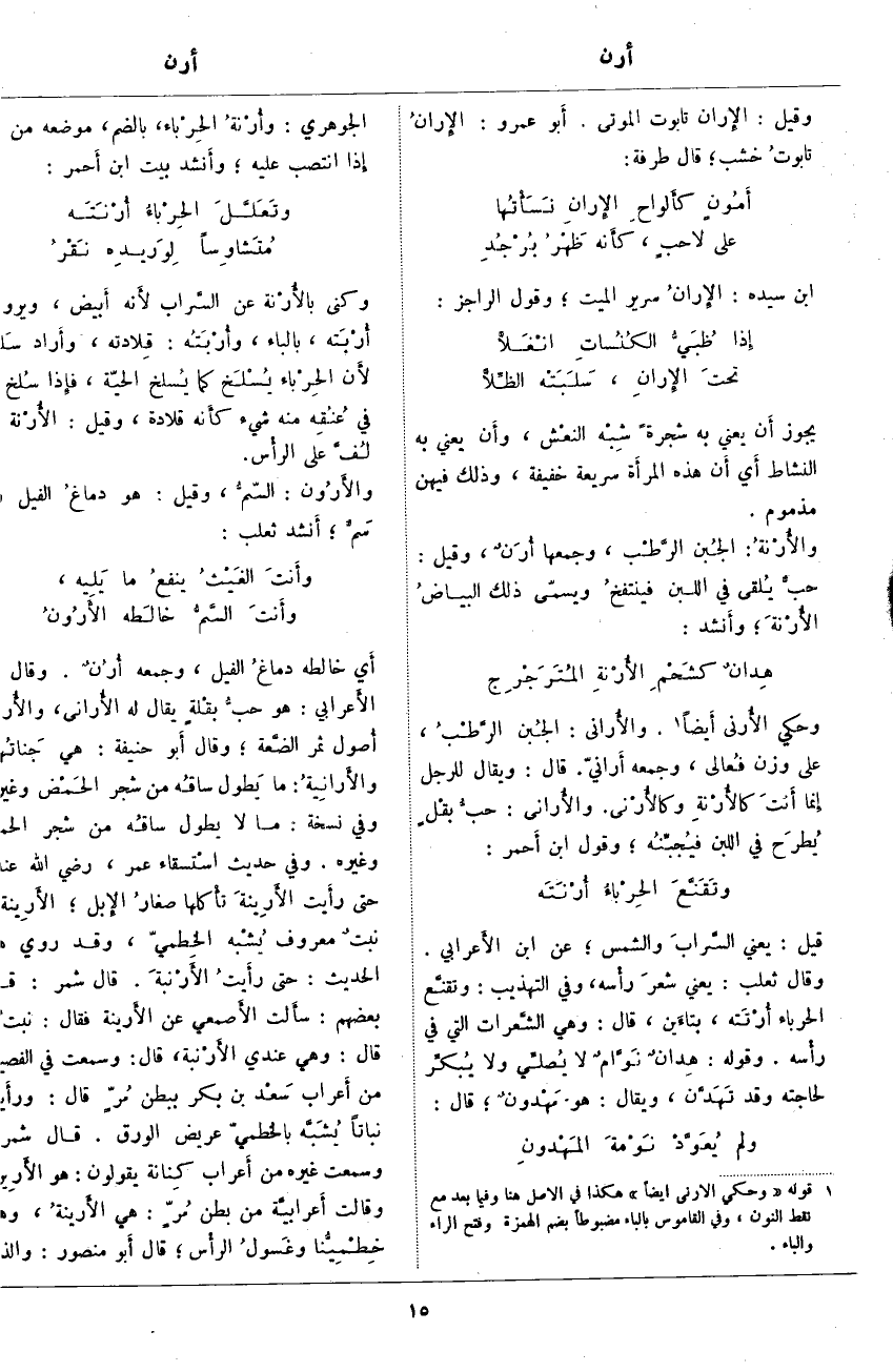 وَحُكِيَ الأُرنى أَيضاً «2». والأُرانى: الجُبن الرَّطبُ، عَلَى وَزْنِ فُعالى، وَجَمْعُهُ أَرانيّ. قَالَ: وَيُقَالُ لِلرَّجُلِ إِنَّمَا أَنتَ كالأُرْنةِ وكالأُرْنى. والأُرانى: حبُّ بقْلٍ يُطرَح فِي اللَّبَنِ فيُجبِّنُه؛ وَقَوْلُ ابْنِ أَحمر:
