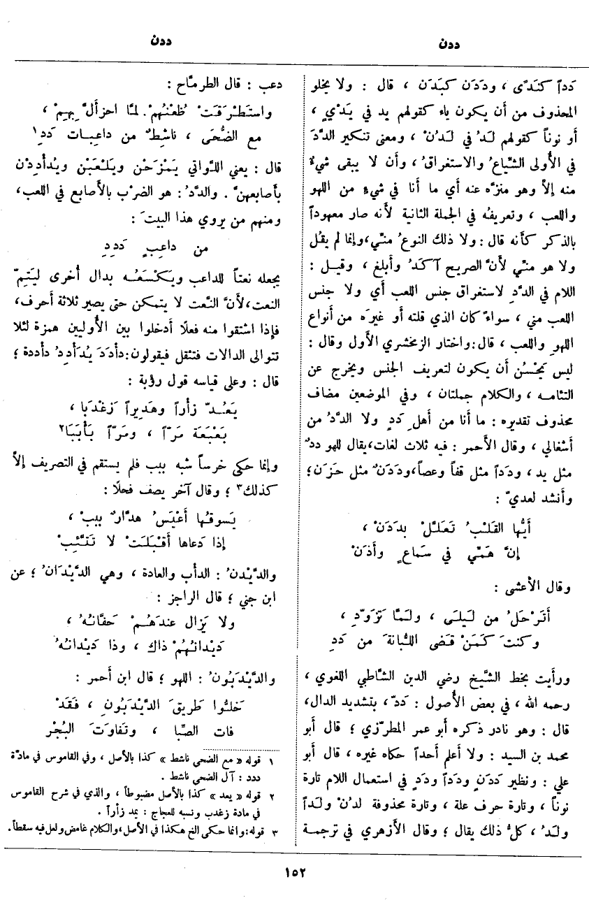 دَداً كنَدًى، ودَدَن كبَدَن، قَالَ: وَلَا يَخْلُو الْمَحْذُوفُ مِنْ أَن يَكُونَ ياءَ كَقَوْلِهِمْ يَدٌ فِي يَدْيٍ، أَو نُونًا كَقَوْلِهِمْ لَدُ فِي لَدُنْ، وَمَعْنَى تَنْكِيرِ الدَّدَ فِي الأُولى الشِّياعُ والاستغراقُ، وأَن لَا يَبْقَى شيءٌ مِنْهُ إِلّا وَهُوَ منزَّه عَنْهُ أَي مَا أَنا فِي شيءٍ مِنَ اللَّهْوِ وَاللَّعِبِ، وتعريفُه فِي الْجُمْلَةِ الثَّانِيَةِ لأَنه صَارَ مَعْهُودًا بِالذِّكْرِ كأَنه قَالَ: وَلَا ذَلِكَ النوعُ منِّي، وإِنما لَمْ يقُل وَلَا هُوَ منِّي لأَنَّ الصَّرِيحَ آكَدُ وأَبلغ، وَقِيلَ: اللَّامُ فِي الدَّدِ لِاسْتِغْرَاقِ جِنْسِ اللَّعِبِ أَي وَلَا جِنْسُ اللعب مني، سواء كان الَّذِي قُلْتُهُ أَو غيرَه مِنْ أَنواع اللهوِ وَاللَّعِبِ، قَالَ: وَاخْتَارَ الزَّمَخْشَرِيُّ الأَول وَقَالَ: لَيْسَ يَحْسُن أَن يَكُونَ لِتَعْرِيفِ الْجِنْسِ وَيَخْرُجُ عَنِ الْتِئَامِهِ، وَالْكَلَامُ جُمْلَتَانِ، وَفِي الْمَوْضِعَيْنِ مُضَافٌ مَحْذُوفٌ تَقْدِيرُهُ: مَا أَنا مِنْ أَهلِ دَدٍ وَلَا الدَّدُ مِنْ أَشغالي، وَقَالَ الأَحمر: فِيهِ ثَلَاثُ لُغَاتٍ، يُقَالُ لِلَّهْوِ ددٌ مِثْلُ يَدٍ، ودَداً مِثْلُ قَفًا وَعَصًا، ودَدَنٌ مِثْلُ حَزَن؛ وأَنشد لِعَدِيٍّ: