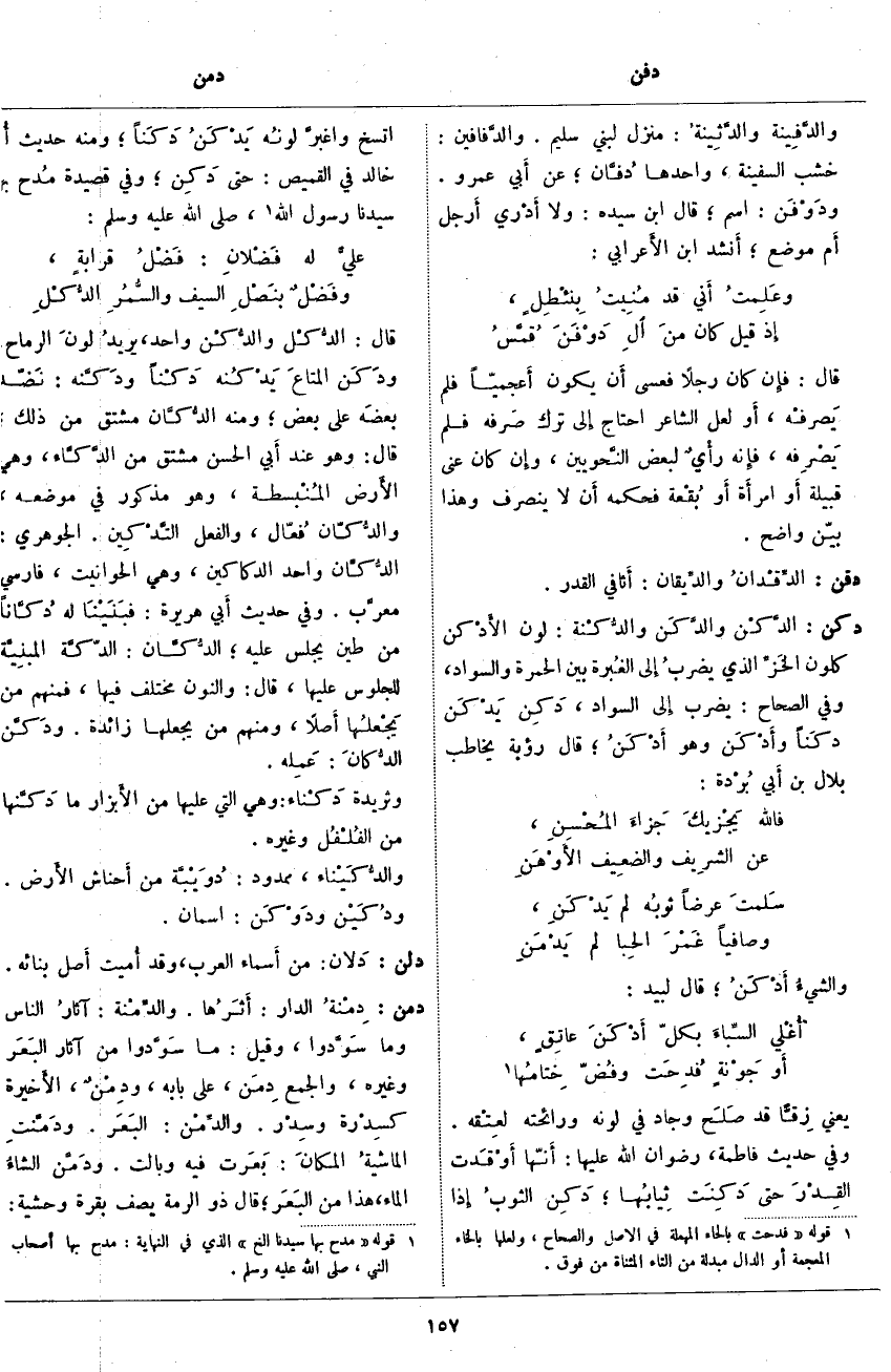 دمن: دِمْنةُ الدَّارِ: أَثَرُها. والدِّمْنة: آثارُ النَّاسِ وَمَا سَوَّدوا، وَقِيلَ: مَا سَوَّدوا مِنْ آثَارِ البَعَر وَغَيْرِهِ، وَالْجَمْعُ دِمَن، عَلَى بَابِهِ، ودِمْنٌ، الأَخيرة كسِدْرة وسِدْر. والدِّمْن: البَعَر. ودَمَّنتِ الماشيةُ المكانَ: بَعَرت فِيهِ وَبَالَتْ. ودَمَّن الشاءُ الْمَاءَ، هَذَا مِنَ البَعَر؛ قَالَ ذُو الرُّمَّةِ يَصِفُ بَقَرَةً وَحْشِيَّةً: