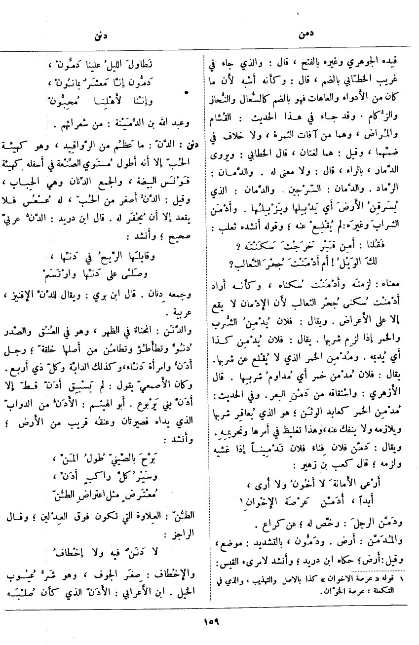 مَعْنَاهُ: لزمتَه وأَدْمَنْت سُكناه، وكأَنه أَراد أَدْمنْت سُكنى جُحْر الثَّعَالِبِ لأَن الإِدْمان لَا يَقَعُ إِلا عَلَى الأَعراض. وَيُقَالُ: فُلَانٌ يُدْمِنُ الشُّرب وَالْخَمْرَ إِذا لزِم شُرْبَهَا. يُقَالُ: فُلَانٌ يُدْمِنُ كَذَا أَي يُديمه. ومُدْمِن الْخَمْرِ الَّذِي لَا يُقْلع عَنْ شُرْبِهَا. يُقَالُ: فُلَانٌ مُدْمن خَمْرٍ أَي مُداومُ شربِها. قَالَ الأَزهري: وَاشْتِقَاقُهُ مِنْ دَمْنِ الْبَعْرِ. وَفِي الْحَدِيثِ: