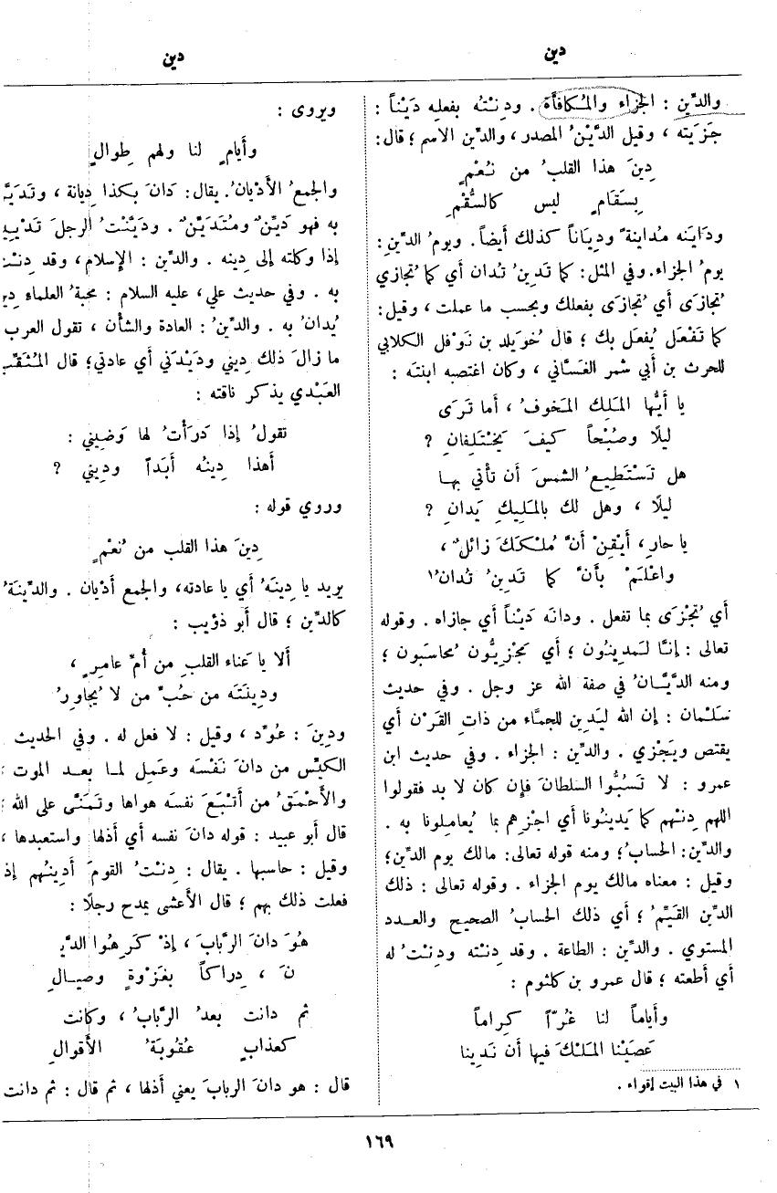 يُرِيدُ يَا دِينَهُ أَي يَا عَادَتَهُ، وَالْجَمْعُ أَدْيان. والدِّينَةُ: كالدِّين، قَالَ أَبو ذُؤَيْبٍ:
