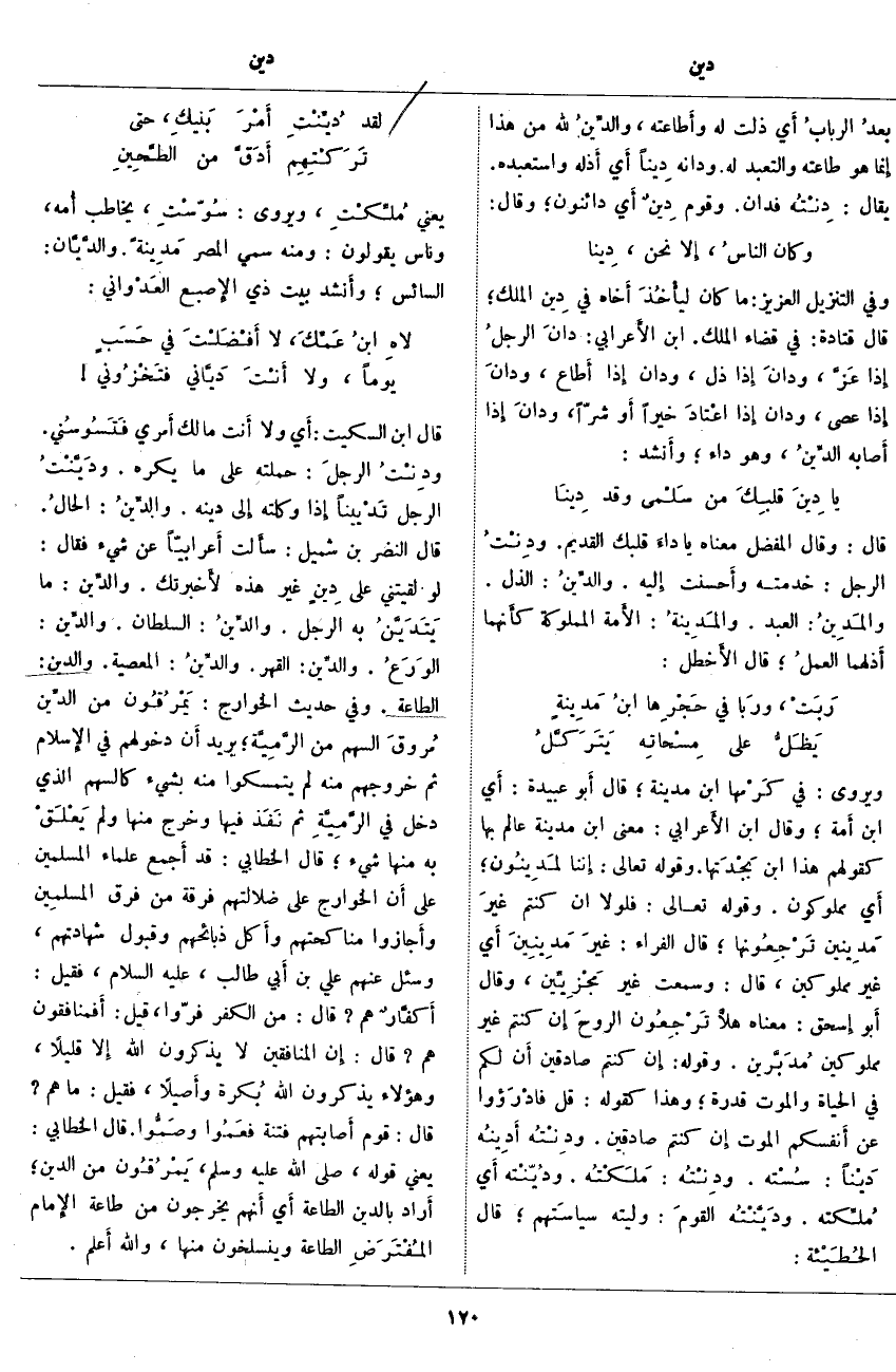 قَالَ ابْنُ السِّكِّيتِ: أَي وَلَا أَنت مَالِكُ أَمري فَتَسُوسُني. ودِنْتُ الرجلَ: حَمَلْتُهُ عَلَى مَا يَكْرَهُ. ودَيَّنْتُ الرَّجُلَ تَدْييناً إِذا وَكَلْتَهُ إِلَى دِينِهِ. والدِّينُ: الحالُ. قَالَ النَّضْرُ بْنُ شُمَيْلٍ: سأَلت أَعرابيّاً عَنْ شَيْءٍ فَقَالَ: لَوْ لَقِيتَنِي عَلَى دِينٍ غَيْرِ هَذِهِ لأَخبرتك. والدِّين: مَا يَتَدَيَّنُ بِهِ الرَّجُلُ. والدِّينُ: السُّلْطَانُ. والدِّين: الوَرَعُ. والدِّين: الْقَهْرُ. والدِّينُ: الْمَعْصِيَةُ. وَالدِّينُ: الطَّاعَةُ. وَفِي حَدِيثِ الْخَوَارِجِ:
