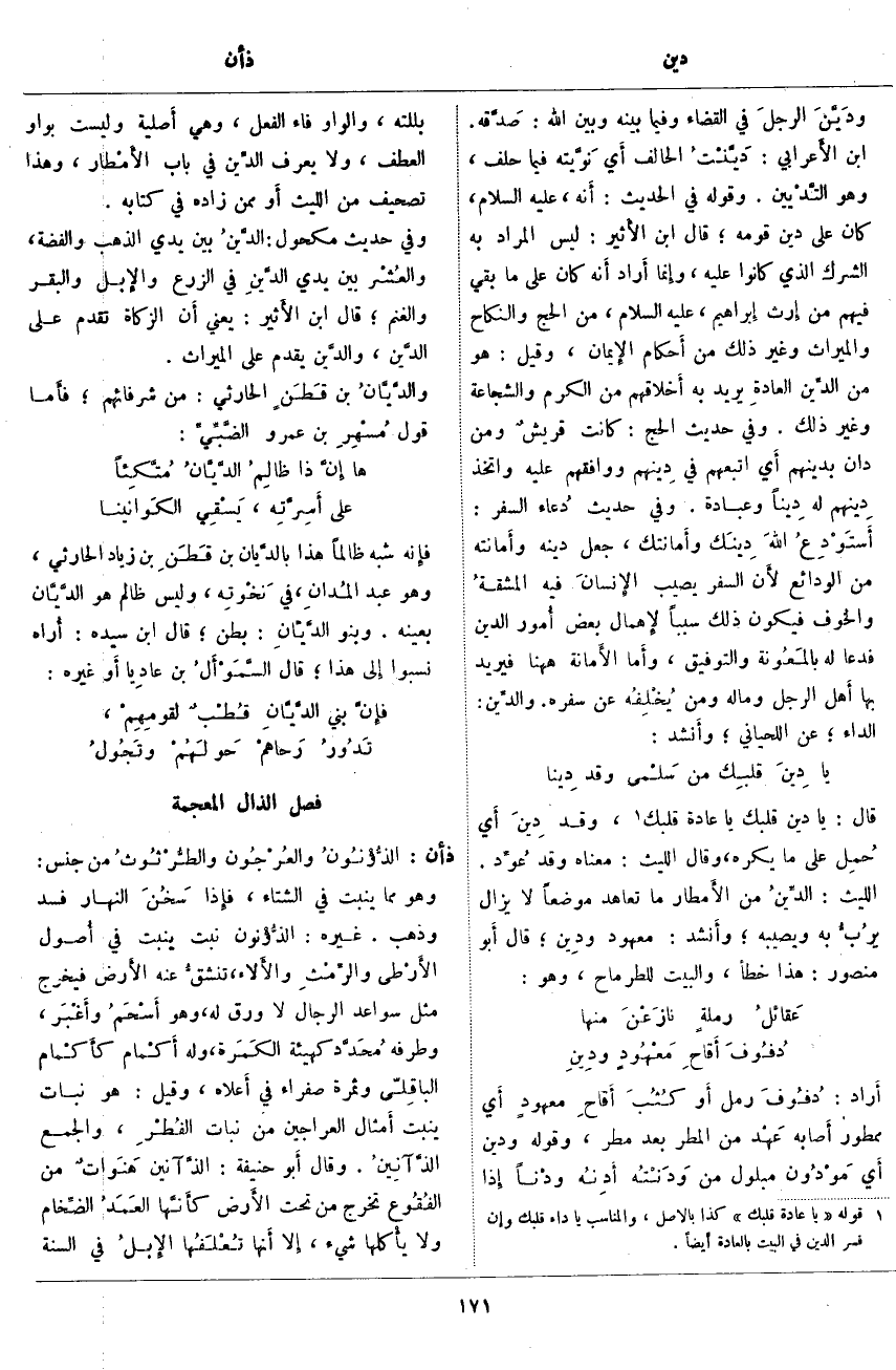 ذأن: الذُّؤْنُونُ والعُرْجُون والطُّرْثُوث مِنْ جِنْسٍ: وَهُوَ مِمَّا يَنْبُتُ فِي الشِّتَاءِ، فإِذا سَخُنَ النَّهَارُ فَسَدَ وَذَهَبَ. غَيْرُهُ: الذُّؤْنون نَبْتٌ يَنْبُتُ فِي أُصول الأَرْطى والرِّمْثِ والأَلاء، تنشقُّ عَنْهُ الأَرض فَيَخْرُجُ مِثْلَ سَوَاعِدِ الرِّجَالِ لَا وَرَقَ لَهُ، وَهُوَ أَسْحَمُ وأَغْبَر، وَطَرَفُهُ مُحَدَّد كَهَيْئَةِ الكَمَرة، وَلَهُ أَكمام كأَكمام الباقِلى وَثَمَرَةٌ صَفْرَاءُ فِي أَعلاه، وَقِيلَ: هُوَ نَبَاتٌ يُنْبِتُ أَمثال الْعَرَاجِينِ مِنْ نَبَاتِ الفُطْرِ، وَالْجَمْعُ الذَّآنِينُ. وَقَالَ أَبو حَنِيفَةَ: الذَّآنين هَنَواتٌ مِنَ الفُقُوع تَخْرُجُ مِنْ تَحْتِ الأَرض كأَنَّها العَمَدُ الضِّخَام وَلَا يأْكلها شَيْءٌ، إِلا أَنها تُعْلَفُها الإِبلُ فِي السَّنَةِ