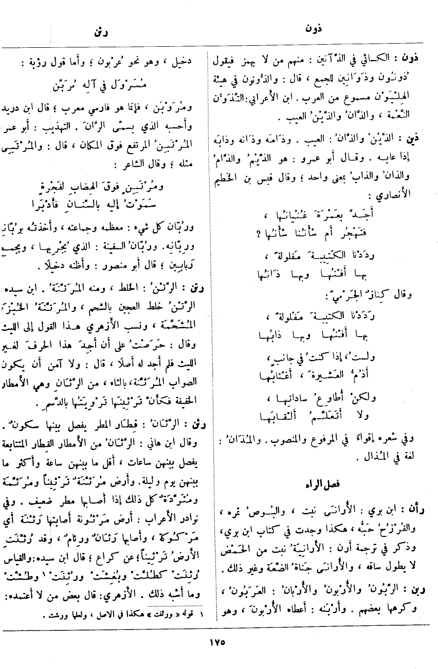 رثن: الرَّثَانُ: قِطَار الْمَطَرِ يَفْصِلُ بَيْنَهَا سكونٌ. وَقَالَ ابْنُ هَانِي: الرَّثَانُ مِنَ الأَمطار القِطار الْمُتَتَابِعَةُ يَفْصِلُ بَيْنَهُنَّ سَاعَاتٌ، أَقَلُّ مَا بَيْنَهُنَّ سَاعَةٌ وأَكثر مَا بَيْنَهُنَّ يَوْمٌ وَلَيْلَةٌ. وأَرض مُرَثَّنَةٌ تَرْثِيناً ومُرَثَّمَة ومُثَرَّدةٌ كُلُّ ذَلِكَ إِذَا أَصابها مَطَرٌ ضَعِيفٌ. وَفِي نَوَادِرِ الأَعراب: أَرض مَرْثُونة أَصابتها رَثْنَة أَي مَرْكُوكة، وأَصابها رَثَانٌ ورِثامٌ، وَقَدْ رُثِّنَتِ الأَرضُ تَرْثِيناً؛ عَنْ كُرَاعٍ؛ قَالَ ابْنُ سِيدَهْ: وَالْقِيَاسُ رُثِنَتْ كطُلَّتْ وبُغِشَتْ ورُثِنَتْ «2». وطُشَّتْ وَمَا أَشبه ذَلِكَ. الأَزهري: قَالَ بَعْضُ مَنْ لَا أَعتمده: