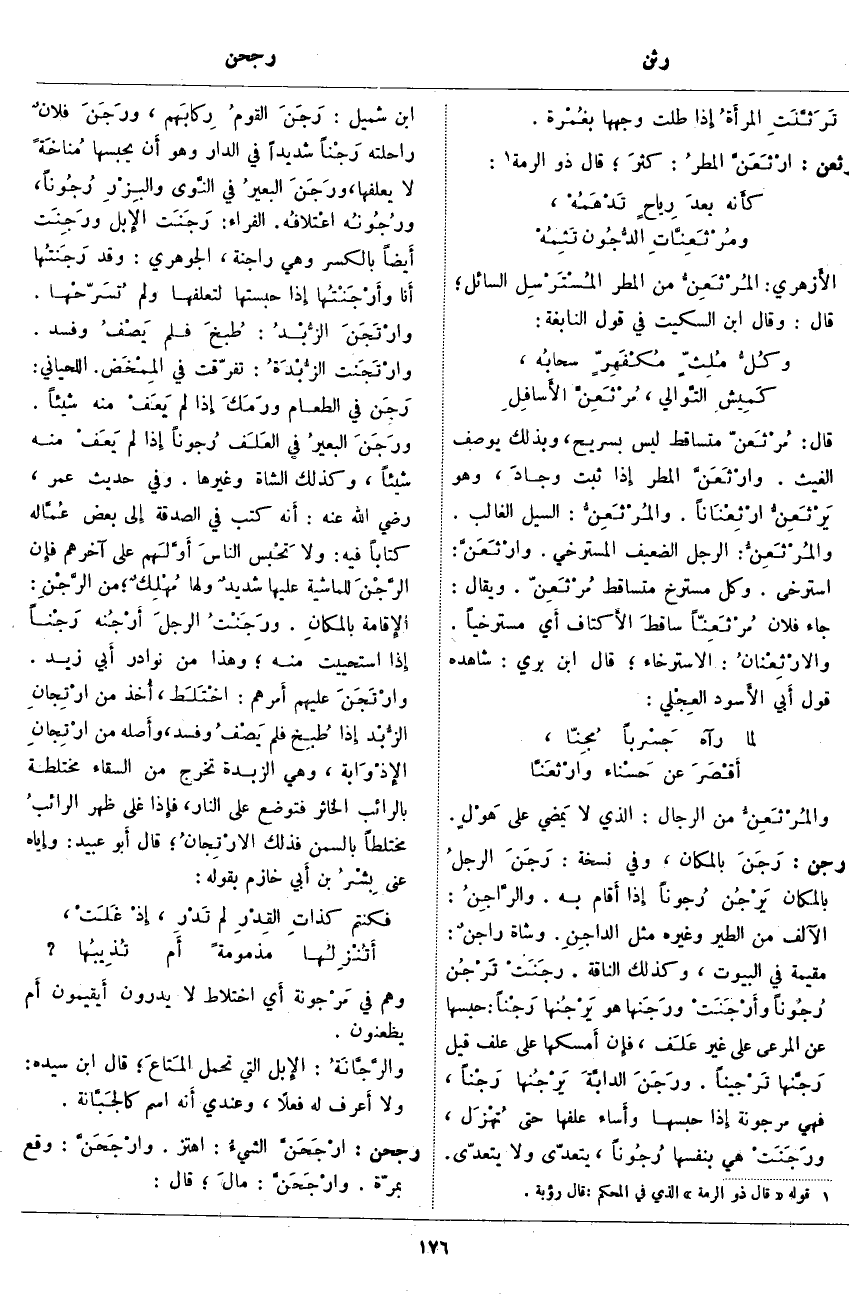 ؛ مِنَ الرَّجْنِ: الإِقامة بالمكانِ. ورَجَنْتُ الرجلَ أَرْجُنه رَجْناً إِذَا اسْتَحْيَيْتَ مِنْهُ؛ وَهَذَا مِنْ نَوَادِرِ أَبي زَيْدٍ. وارْتَجَنَ عَلَيْهِمْ أَمرهم: اخْتَلَطَ، أُخذ مِنَ ارْتِجانِ الزُّبْد إِذَا طُبِخ فَلَمْ يَصْفُ وَفَسَدَ، وأَصله مِنَ ارْتِجانِ الإِذْوَابة، وَهِيَ الزُّبْدَةُ تَخْرُجُ مِنَ السِّقَاءِ مُخْتَلِطَةً بِالرَّائِبِ الْخَاثِرِ فَتُوضَعُ عَلَى النَّارِ، فإِذا غَلَى ظَهَرَ الرائبُ مُخْتَلِطًا بِالسَّمْنِ فَذَلِكَ الارْتِجانُ؛ قَالَ أَبو عُبَيْدٍ: وَإِيَّاهُ عَنَى بِشْرُ بْنُ أَبي خَازِمٍ بِقَوْلِهِ: