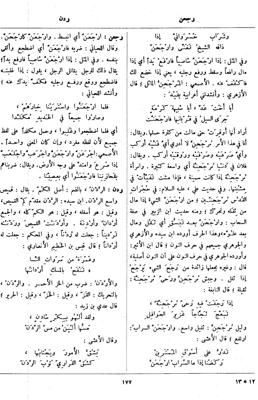 أَراد أَنها أُوقِرَتْ حَتَّى مَالَتْ مِنْ كَثْرَةِ حَمْلِهَا. وَيُقَالُ: أَنا فِي هَذَا الأَمر مُرْجَحِنٌّ لَا أَدري أَيَّ فَنَّيْه أَركب وأَيَّ صَرْعَيْه وصَرْفَيْه ورُوقَيْه أَركب. وَيُقَالُ: فُلَانٌ فِي دُنْيا مُرْجَحِنَّة أَي وَاسِعَةٍ كَثِيرَةٍ. وامرأَة مُرْجَحِنَّة إِذَا كَانَتْ سَمِينَةً، فإِذا مَشَتْ تَفَيَّأَتْ فِي مِشْيتها. وَفِي حَدِيثِ