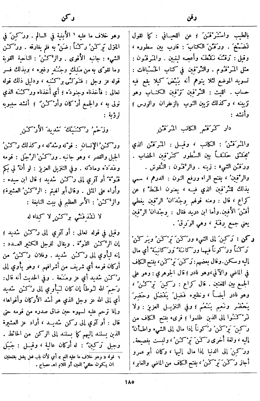 ركن: رَكِنَ إِلَى الشيءِ ورَكَنَ يَرْكَنُ ويَرْكُنُ رَكْناً ورُكوناً فِيهِمَا ورَكانَةً ورَكانِيَةً أَي مَالَ إِلَيْهِ وَسَكَنَ. وَقَالَ بَعْضُهُمْ: رَكَنَ يَرْكَن، بِفَتْحِ الْكَافِ فِي الْمَاضِي وَالْآتِي، وَهُوَ نَادِرٌ؛ قَالَ الْجَوْهَرِيُّ: وَهُوَ عَلَى الْجَمْعِ بَيْنَ اللُّغَتَيْنِ. قَالَ كُرَاعٌ: رَكِنَ يَرْكُنُ، وَهُوَ نَادِرٌ أَيضاً، وَنَظِيرُهُ فَضِلَ يَفْضُل وحَضِرَ يَحْضُر ونَعِمَ يَنْعُم؛ وَفِي التَّنْزِيلِ الْعَزِيزِ: وَلا تَرْكَنُوا إِلَى الَّذِينَ ظَلَمُوا