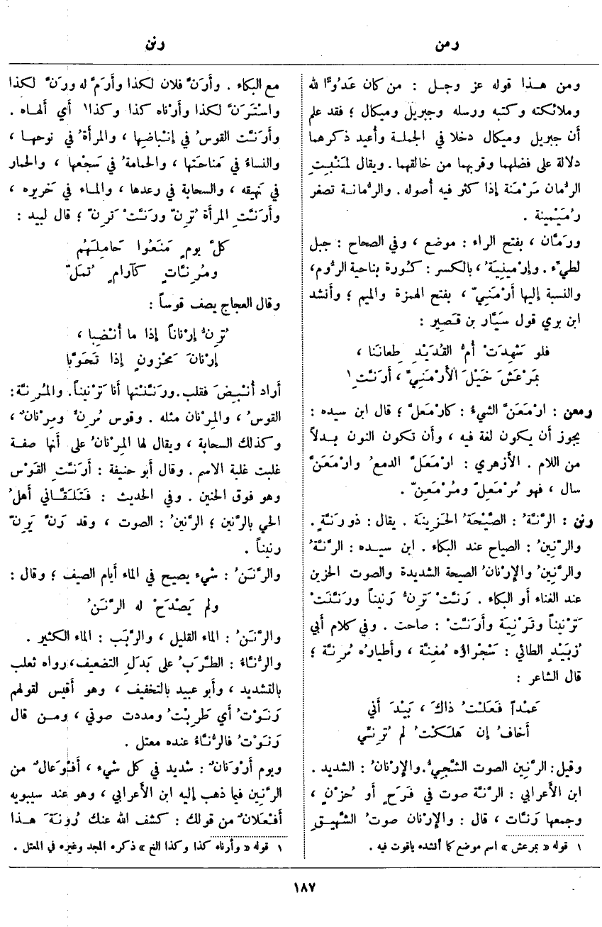 وَقِيلَ: الرَّنِين الصَّوْتُ الشَّجِيُّ. والإِرْنانُ: الشَّدِيدُ. ابْنُ الأَعرابي: الرَّنَّة صَوْتٌ فِي فَرَحٍ أَو حُزْنٍ، وَجَمْعُهَا رَنَّات، قَالَ: والإِرْنان صوتُ الشَّهيقِ مَعَ الْبُكَاءِ. وأَرَنَّ فُلَانٌ لِكَذَا وأَرَمَّ لَهُ ورَنَّ لِكَذَا واسْتَرَنَّ لِكَذَا وأَرْناه كَذَا وَكَذَا «2». أَي أَلْهَاهُ. وأَرَنَّت القوسُ فِي إنباضِها، والمرأَةُ فِي نَوْحِهَا، والنساءُ فِي مَناحَتها، والحمامةُ فِي سَجْعها، وَالْحِمَارُ فِي نَهيقه، وَالسَّحَابَةُ فِي رَعْدِهَا، وَالْمَاءُ فِي خَريره، وأَرَنَّتِ المرأَة تُرِنّ ورَنَّتْ تَرِنّ؛ قَالَ لَبِيدٌ: