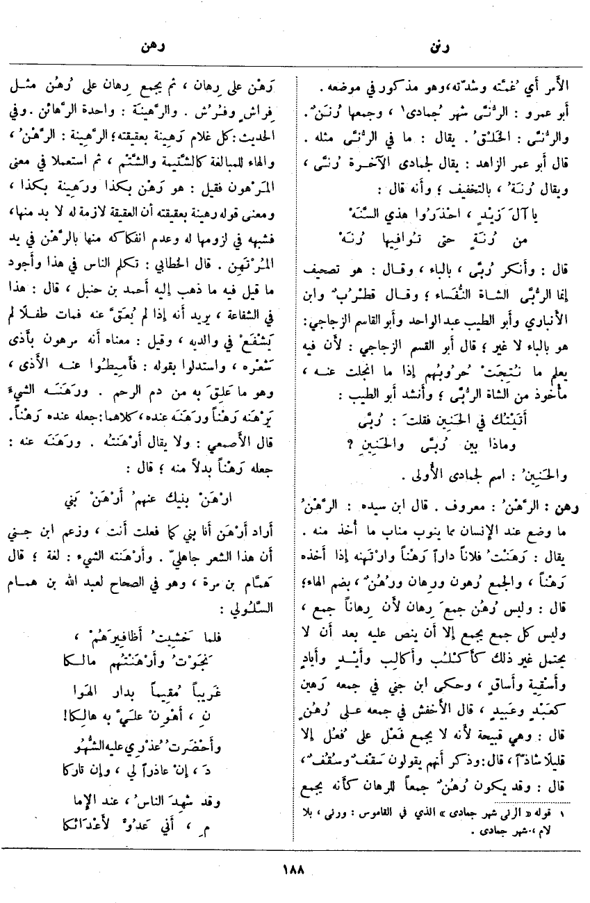 رهن: الرَّهْنُ: مَعْرُوفٌ. قَالَ ابْنُ سِيدَهْ: الرَّهْنُ مَا وُضِعَ عِنْدَ الإِنسان مِمَّا يَنُوبُ مَنَابَ مَا أُخذ مِنْهُ. يُقَالُ: رَهَنْتُ فُلَانًا دَارًا رَهْناً وارْتَهنه إِذَا أَخذه رَهْناً، وَالْجَمْعُ رُهون ورِهان ورُهُنٌ، بِضَمِّ الْهَاءِ؛ قَالَ: وَلَيْسَ رُهُن جمعَ رِهان لأَن رِهاناً جَمْعٌ، وَلَيْسَ كُلُّ جَمْعٍ يُجْمَعُ إِلَّا أَن يُنَصَّ عَلَيْهِ بَعْدَ أَن لَا يَحْتَمِلَ غَيْرَ ذَلِكَ كأَكْلُب وأَكالِب وأَيْدٍ وأَيادٍ وأَسْقِية وأَساقٍ، وَحَكَى ابْنُ جِنِّي فِي جَمْعِهِ رَهين كعَبْدٍ وعَبيدٍ، قَالَ الأَخفش فِي جَمْعِهِ عَلَى رُهُنٍ قَالَ: وَهِيَ قَبِيحَةٌ لأَنه لَا يُجْمَعُ فَعْل عَلَى فُعُل إِلَّا قَلِيلًا شَاذًّا، قَالَ: وَذَكَرَ أَنهم يَقُولُونَ سَقْفٌ وسُقُفٌ، قَالَ: وَقَدْ يَكُونُ رُهُنٌ جَمْعًا لِلرِّهَانِ كأَنه يُجْمَعُ رَهْن عَلَى رِهان، ثُمَّ يُجْمَعُ رِهان عَلَى رُهُن مِثْلُ فِراشٍ وفُرُش. والرَّهينة: وَاحِدَةُ الرَّهائن. وَفِي الْحَدِيثِ: