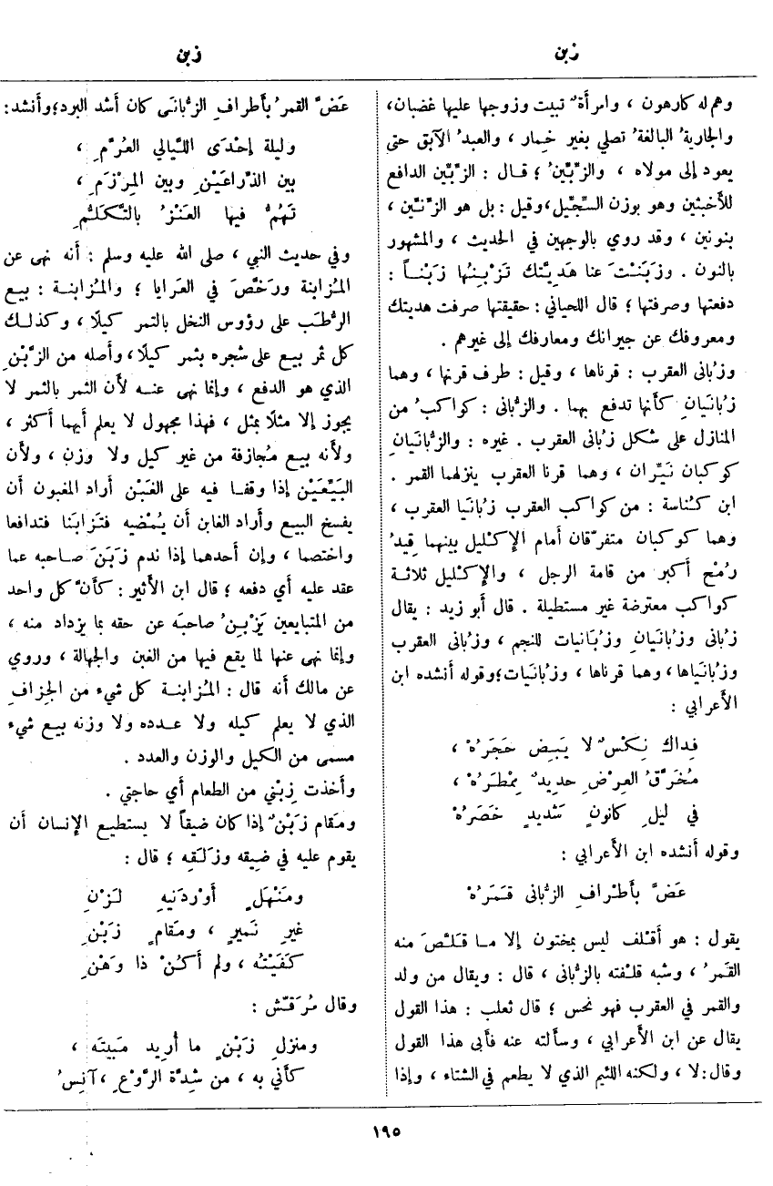؛ قَالَ الزِّبِّين الدَّافِعُ للأَخبثين وَهُوَ بِوَزْنِ السِّجِّيل، وَقِيلَ: بَلْ هُوَ الزِّنِّين، بِنُونَيْنِ، وَقَدْ رُوِيَ بِالْوَجْهَيْنِ فِي الْحَدِيثِ، وَالْمَشْهُورُ بِالنُّونِ. وزَبَنْتَ عَنَّا هَدِيَّتك تَزْبِنُها زَبْناً: دَفَعْتَهَا وَصَرَفْتَهَا؛ قَالَ اللِّحْيَانِيُّ: حَقِيقَتُهَا صَرَفْتَ هَدِيَّتَكَ وَمَعْرُوفَكَ عَنْ جِيرَانِكَ وَمَعَارِفِكَ إِلَى غَيْرِهِمْ. وزُبانى الْعَقْرَبِ: قَرْنَاهَا، وَقِيلَ: طَرَفُ قَرْنِهَا، وَهُمَا زُبانَيانِ كأَنها تَدْفَعُ بِهِمَا. والزُّباني: كواكبُ مِنَ الْمَنَازِلِ عَلَى شَكْلِ زُبانى الْعَقْرَبِ. غَيْرُهُ: والزُّبانَيانِ كَوْكَبَانِ نَيِّرانِ، وَهُمَا قَرْنَا الْعَقْرَبِ يَنْزِلُهُمَا الْقَمَرُ. ابْنُ كُناسة: مِنْ كَوَاكِبِ الْعَقْرَبِ زُبانَيا الْعَقْرَبِ، وَهُمَا كَوْكَبَانِ مُتَفَرِّقَانِ أَمام الإِكليل بَيْنَهُمَا قِيدُ رُمْح أَكبر مِنْ قَامَةِ الرَّجُلِ، والإِكْليل ثَلَاثَةُ كَوَاكِبَ مُعْتَرِضَةٍ غَيْرِ مُسْتَطِيلَةٍ. قَالَ أَبو زَيْدٍ: يُقَالُ زُباني وزُبانَيانِ وزُبَانيات لِلنَّجْمِ، وزُبانى الْعَقْرَبِ وزُبانَياها، وَهُمَا قَرْنَاهَا، وزُبانَيات؛ وَقَوْلُهُ أَنشده ابْنُ الأَعرابي: