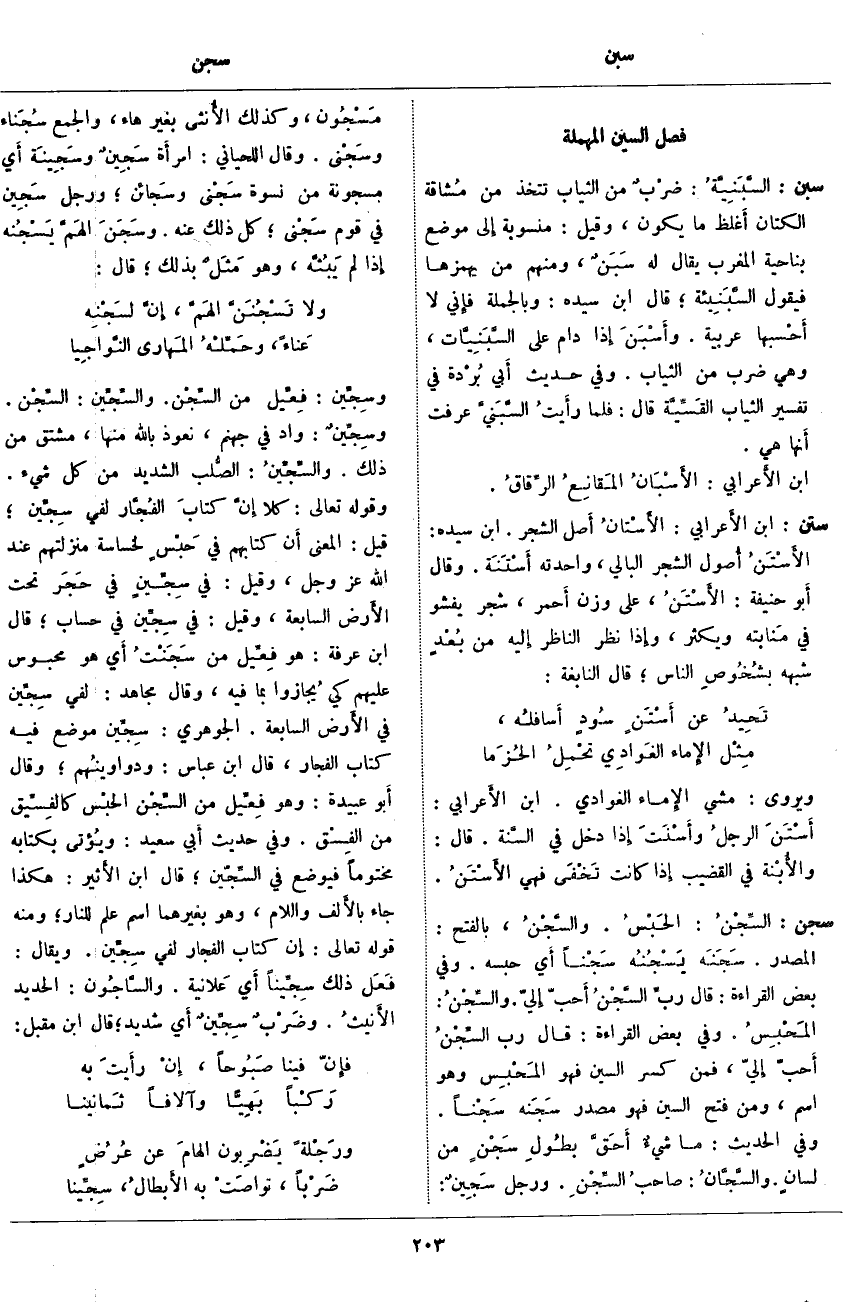 سجن: السِّجْنُ: الحَبْسُ. والسَّجْنُ، بِالْفَتْحِ: الْمَصْدَرُ. سَجَنَه يَسْجُنُه سَجْناً أَي حَبَسَهُ. وَفِي بَعْضِ الْقِرَاءَةِ: قَالَ