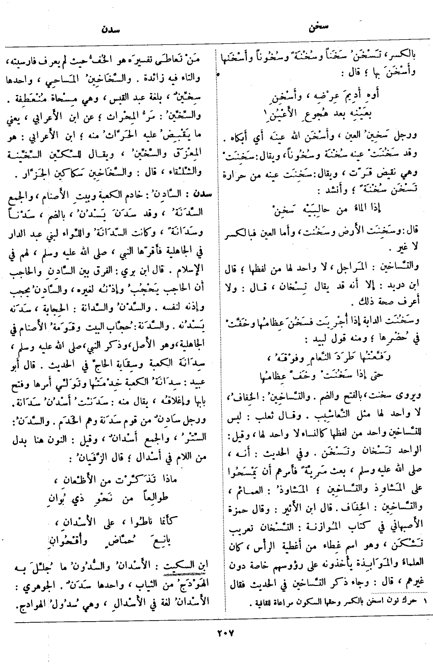 سدن: السَّادِنُ: خَادِمُ الْكَعْبَةِ وبيتِ الأَصنام، وَالْجَمْعُ السَّدَنَةُ، وَقَدْ سَدَنَ يَسْدُنُ، بِالضَّمِّ، سَدْناً وسَدَانَةً، وَكَانَتِ السَّدَانَةُ واللِّواءِ لِبَنِي عَبْدِ الدَّارِ فِي الْجَاهِلِيَّةِ فأَقرّها النَّبِيُّ، صَلَّى اللَّهُ عَلَيْهِ وَسَلَّمَ، لَهُمْ فِي الإِسلام. قَالَ ابْنُ بَرِّيٍّ: الْفَرْقُ بَيْنَ السَّادِنِ وَالْحَاجِبِ أَن الْحَاجِبَ يَحْجُبُ وإِذْنُه لِغَيْرِهِ، والسَّادِنُ يَحْجُبُ وَإِذْنُهُ لِنَفْسِهِ. والسَّدْنُ والسِّدانة: الحِجابة، سَدَنه يَسْدُنه. والسَّدَنة: حُجَّاب الْبَيْتِ وقَوَمةُ الأَصنام فِي الْجَاهِلِيَّةِ، وَهُوَ الأَصل، وَذَكَرَ النَّبِيُّ، صَلَّى اللَّهُ عَلَيْهِ وَسَلَّمَ، سِدَانَة الْكَعْبَةِ وسِقَاية الحاجِّ فِي الْحَدِيثَ. قَالَ أَبو عُبَيْدٍ: سِدَانَة الْكَعْبَةِ خِدْمَتُها وتَوَلِّي أَمرها وَفَتْحُ بَابِهَا وإِغلاقُه، يُقَالُ مِنْهُ: سَدَنْتُ أَسْدُنُ سَدَانة. وَرَجُلٌ سَادِنٌ مِنْ قَوْمٍ سَدَنة وَهُمُ الخَدَم. والسَّدَنُ: السِّتْرُ، وَالْجَمْعُ أَسْدانٌ، وَقِيلَ: النُّونُ هُنَا بَدَلٌ مِنَ اللَّامِ فِي أَسْدال؛ قَالَ الزَّفَيانُ: