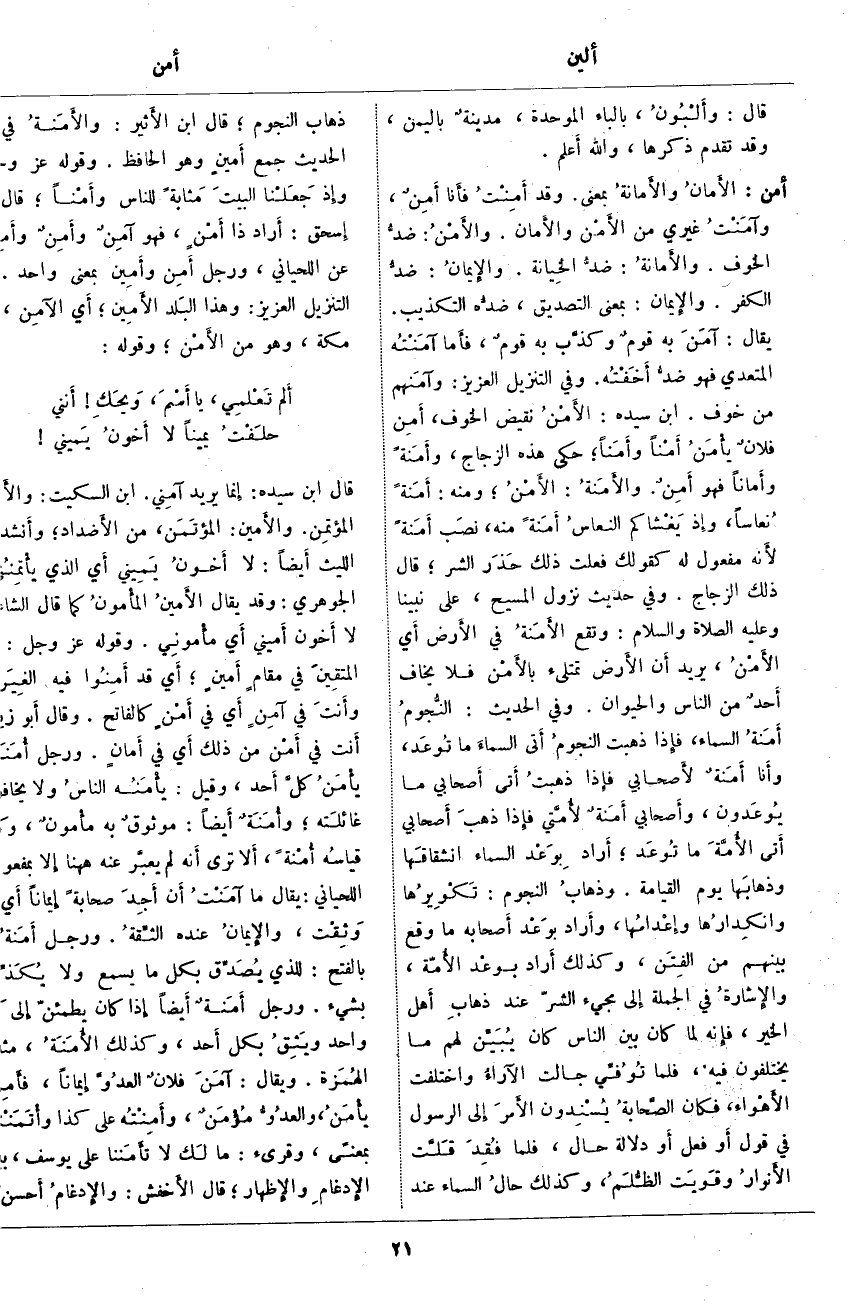 أمن: الأَمانُ والأَمانةُ بِمَعْنًى. وَقَدْ أَمِنْتُ فأَنا أَمِنٌ، وآمَنْتُ غَيْرِي مِنَ الأَمْن والأَمان. والأَمْنُ: ضدُّ الْخَوْفِ. والأَمانةُ: ضدُّ الخِيانة. والإِيمانُ: ضدُّ الْكُفْرِ. والإِيمان: بِمَعْنَى التَّصْدِيقِ، ضدُّه التَّكْذِيبُ. يُقَالُ: آمَنَ بِهِ قومٌ وكذَّب بِهِ قومٌ، فأَما آمَنْتُه الْمُتَعَدِّي فَهُوَ ضدُّ أَخَفْتُه. وَفِي التَّنْزِيلِ الْعَزِيزِ: وَآمَنَهُمْ مِنْ خَوْفٍ