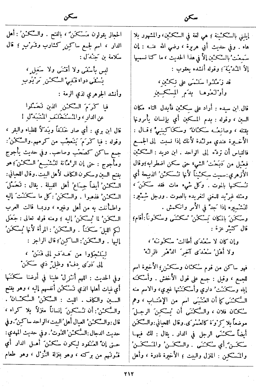 ؛ هو بِفَتْحِ السِّينِ وَسُكُونِ الْكَافِ لأَهل الْبَيْتِ. وَقَالَ اللِّحْيَانِيُّ: السَّكْنُ أَيضاً جِمَاعُ أَهل الْقَبِيلَةِ. يُقَالُ: تَحَمَّلَ السَّكْنُ فَذَهَبُوا. والسَّكَنُ: كُلُّ مَا سَكَنْتَ إِلَيْهِ واطمأْنَنت بِهِ مِنْ أَهل وَغَيْرِهِ، وَرُبَّمَا قَالَتِ الْعَرَبُ السَّكَنُ لِمَا يُسْكَنُ إِلَيْهِ؛ وَمِنْهُ قَوْلُهُ تَعَالَى: جَعَلَ اللَّيْلَ سَكَناً